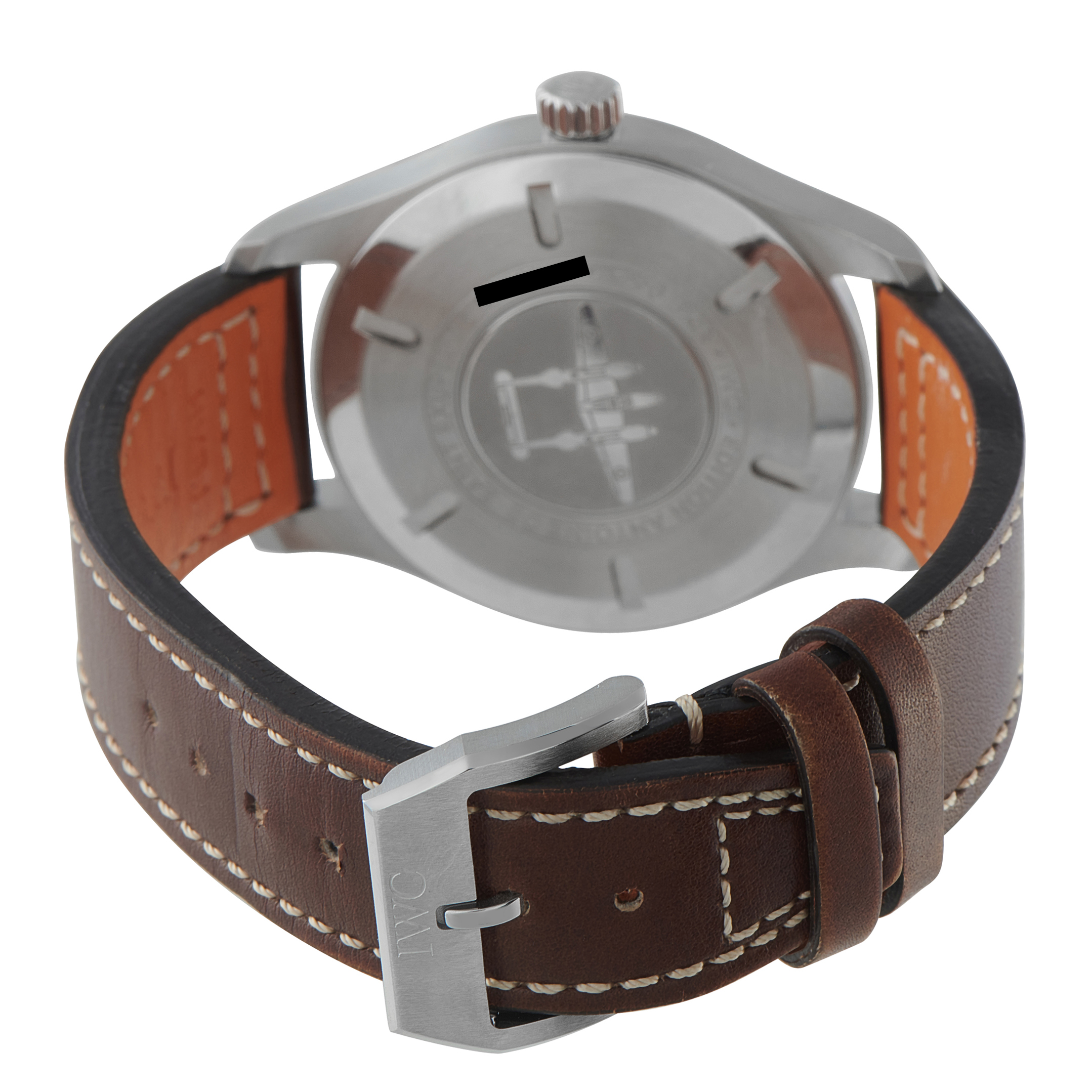 The IWC Pilot’s Watch ref. IW327003 honors the aviation legacy of Antoine de Saint-Exupéry through a restrained, heritage-inspired design. Its stainless steel case frames a warm brown dial inspired by early cockpit instruments, featuring large Arabic numerals and a clear minute track. A soft iron inner case protects the movement from magnetic fields, while the engraved caseback (with the Lockheed P-38 Lightning aircraft) highlights the commemorative intent. Power is provided by the self-winding Caliber 35111, offering date and central hacking seconds for precise time synchronization.