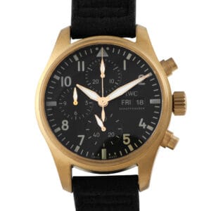 A limited edition Pilot’s Chronograph released by IWC in celebration of the 10th anniversary of MR PORTER. Only 110 pieces of this model have been made available. The watch features a bead-blasted bronze case measuring 41mm in diameter, with a solid titanium case back. The bronze case is paired with a black dial and a black fabric strap, for a military-inspired yet casual look. On the dial are three sub-dials, side by side day and date windows at 3 o’clock, and gold-tone Arabic numeral hour markers with a Super-LumiNova-filled numeral “10.” The hands are also luminous. Housed inside the case is the IWC-manufactured caliber 69380 automatic movement offering a power reserve of 46 hours.