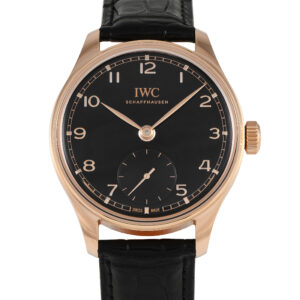 Clean and classic, this impeccably crafted timepiece features a 40mm case crafted from 18K 5N Gold and a black alligator leather strap. The black Obsidian dial comes complete with gold toned hands, Arabic numeral hour markers, and a small seconds subdial located at the 6-o-clock position. It’s powered by an IWC-manufactured 82200 caliber automatic movement with a power reserve of approximately 60 hours.