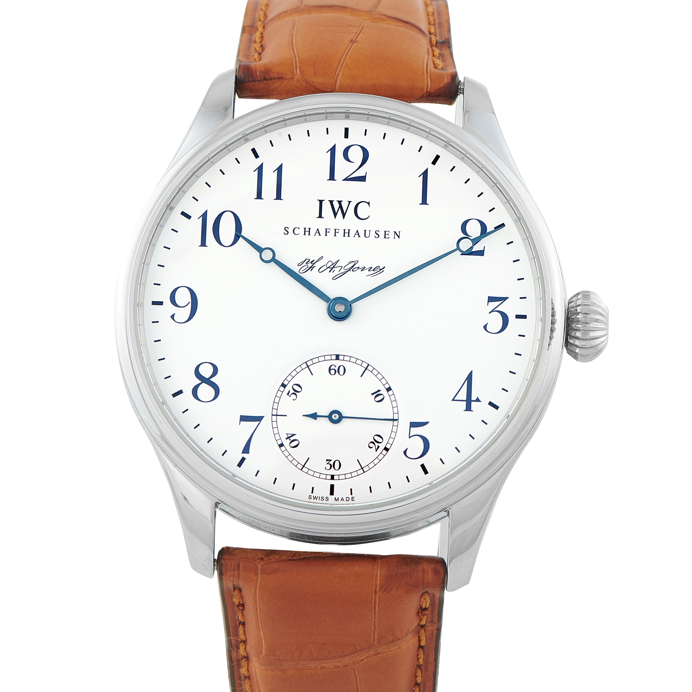 Expect impeccable clarity and elegance on the wrist from this limited edition IWC timepiece. The Portugieser F.A. Jones ref. HIW544203 is a heartfelt homage to the American founder, Florentine Ariosto Jones. It is designed with a generously proportioned 43mm steel case, housing the Caliber 98290 manual-wind movement. The classic white enamel dial is detailed with oversized Arabic numerals and slim, blued-steel hands. This model is limited to 3,000 pieces.