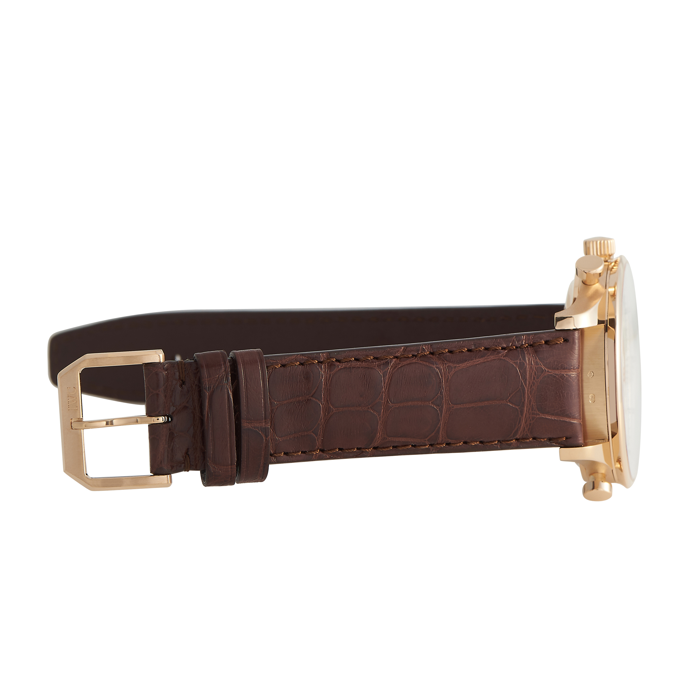 The IWC Portuguese Rattrapante or Split Second Chronograph ref.3712-03 is a dress watch that suits most wrists and outfits. It has a wearable 40.5mm case and a simple yet timeless design. The case is crafted in solid 18K rose gold, and worn on a brown leather strap. On its silver dial are rose gold feuille hands, applied rose gold Arabic numeral hour markers, applied minute markers, and two sub-dials. Powering this timepiece is caliber 76240, a 3Hz, 31-jewel hand-wound movement that provides 44 hours of power reserve when fully wound. The watch is water resistant up to 30 meters.