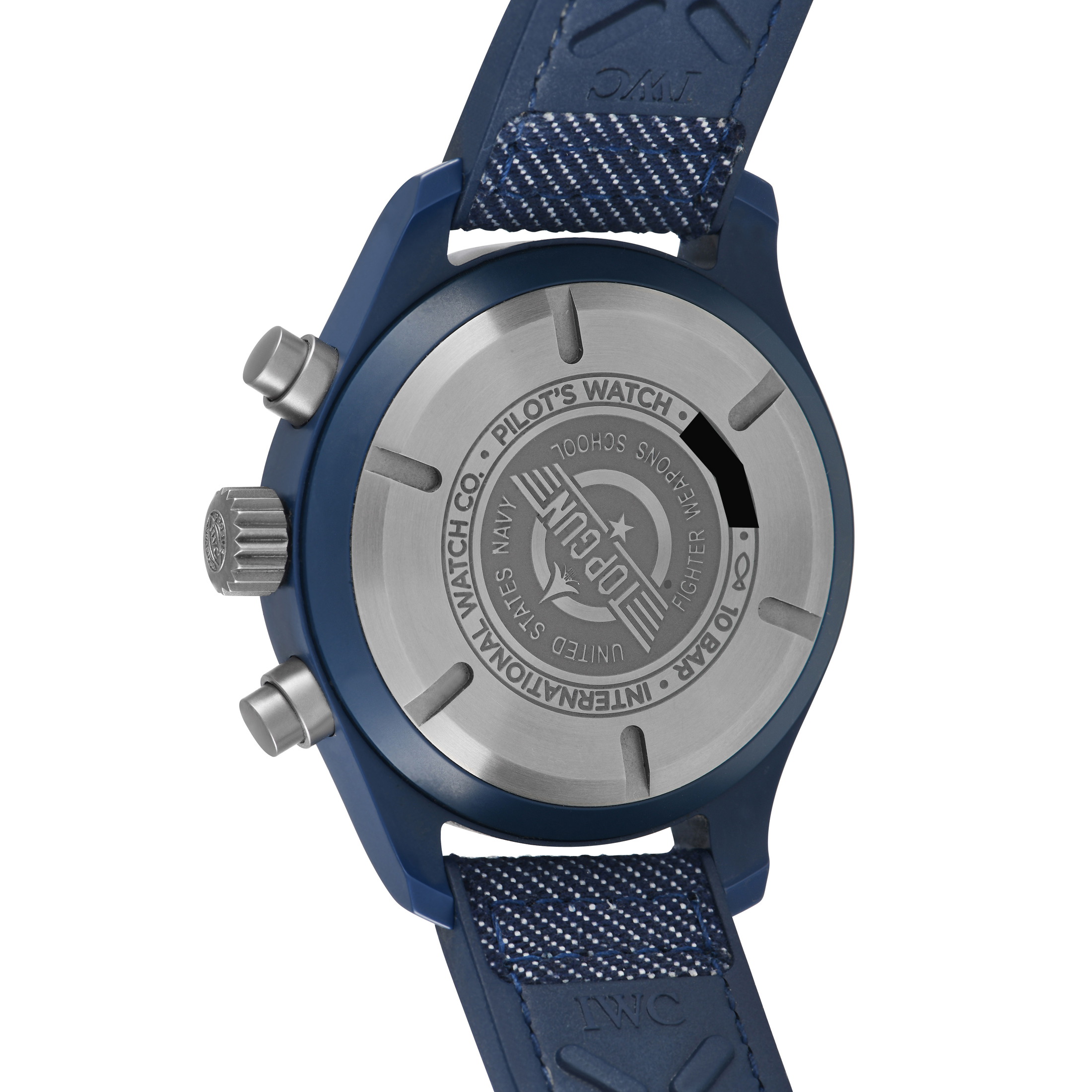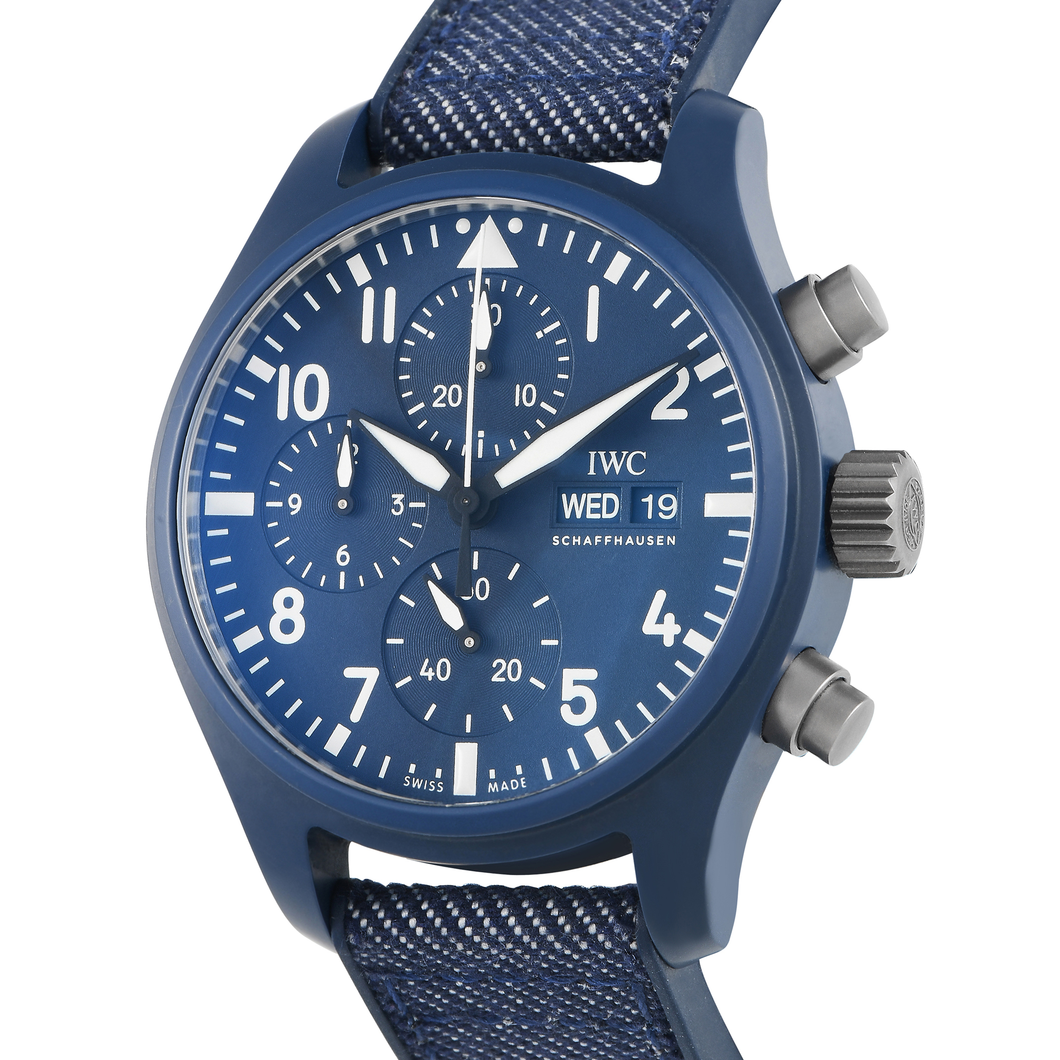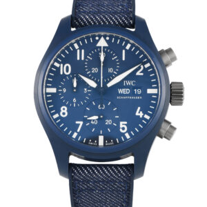 The IWC Top Gun Pilot’s Chronograph Watch, reference number IW389404, is offered here in the eye-catching Oceana coloration.