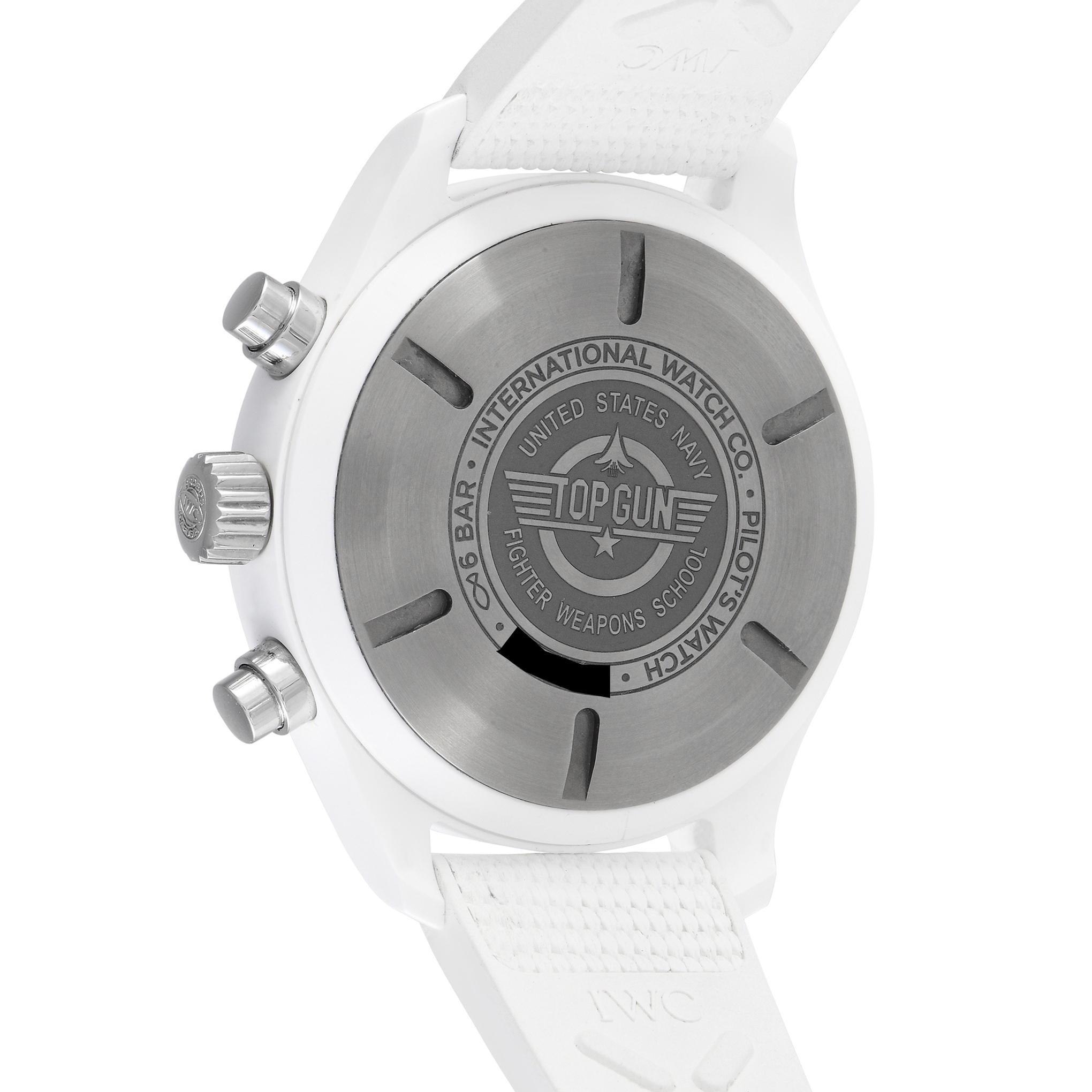 Made to be noticed, this bold watch in monochromatic white and black offers a remarkable look and tactile feel. Its 44.5mm case is rendered in satin white ceramic worn on a white rubber strap with a textured textile-like inlay. Legibility is assured by a large, black dial displaying the time, day and date, and chronograph hour, minutes, and seconds. Powering the watch is the IWC-manufactured caliber 69380 self-winding movement with 242 components, 33 jewels, and 46 hours of power reserve.