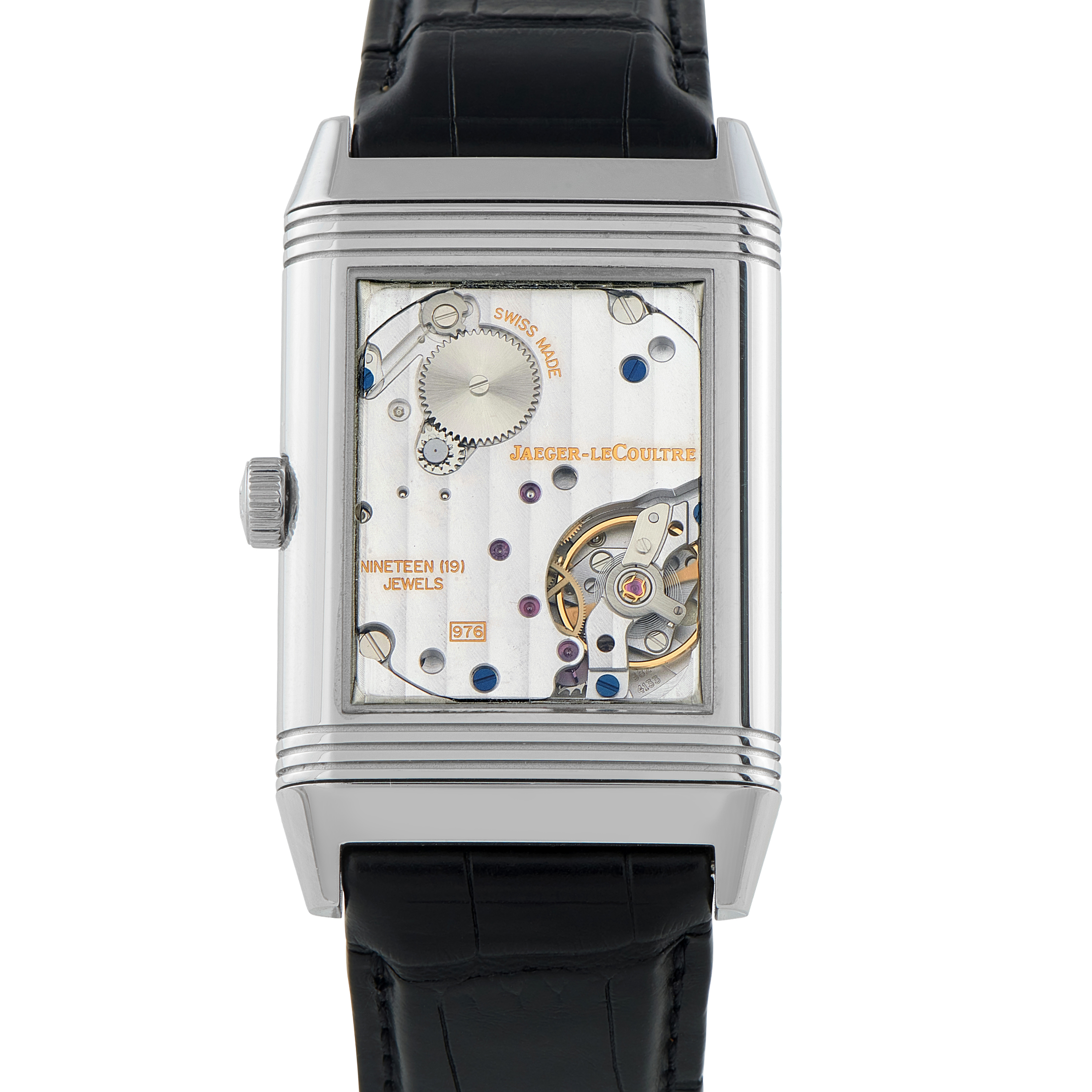 Jaeger-LeCoultre Grande Reverso ref. 273.8.04 returns to the essentials of the 1931 design. The stainless steel rectangular case swivels within its carriage, originally conceived to shield the dial during polo matches. On the front, a silvered dial with Arabic numerals, an inner minute track, and small seconds maintains period fidelity. No date interrupts the layout. The manual-winding JLC Caliber 976 preserves the slim profile that defines the Reverso profile.
