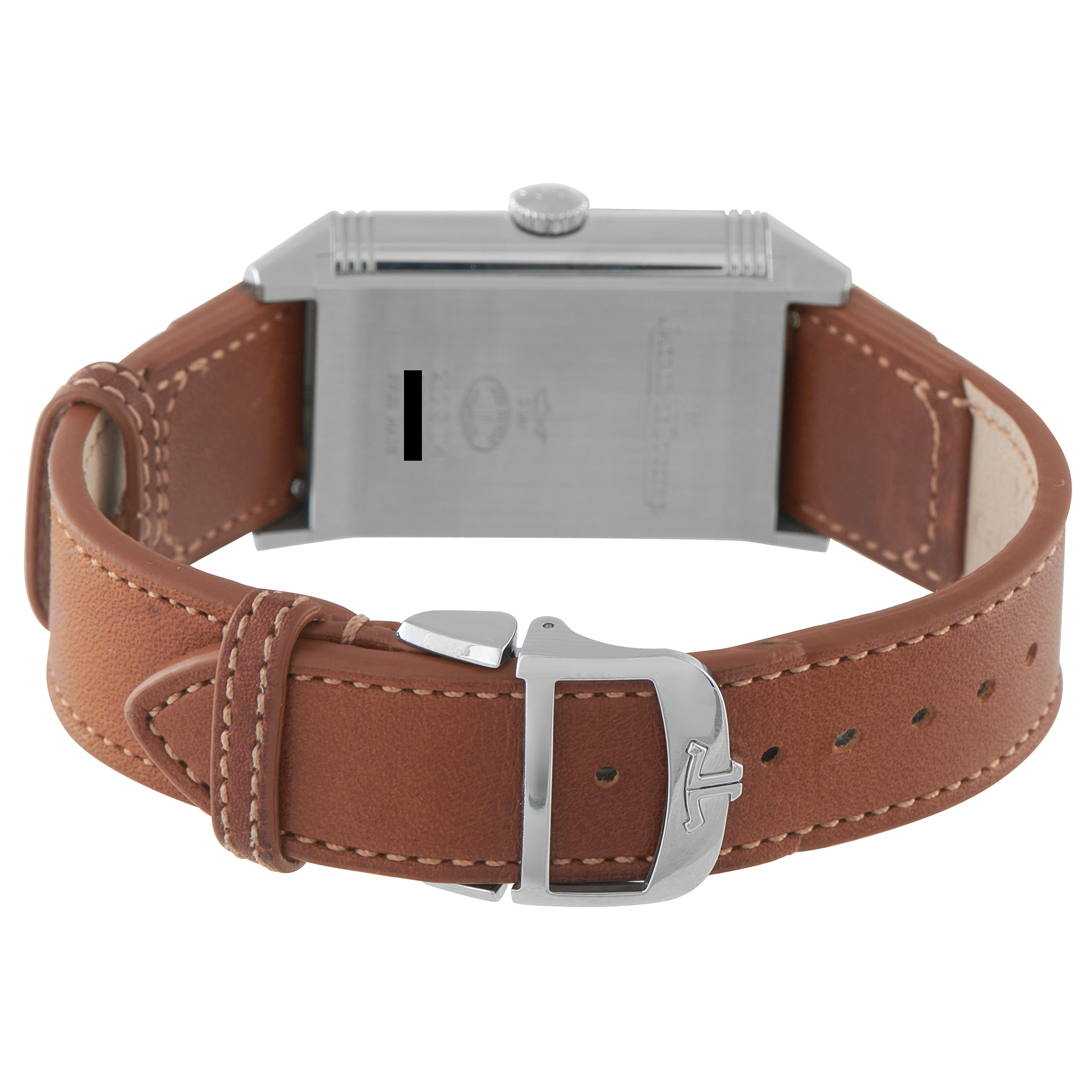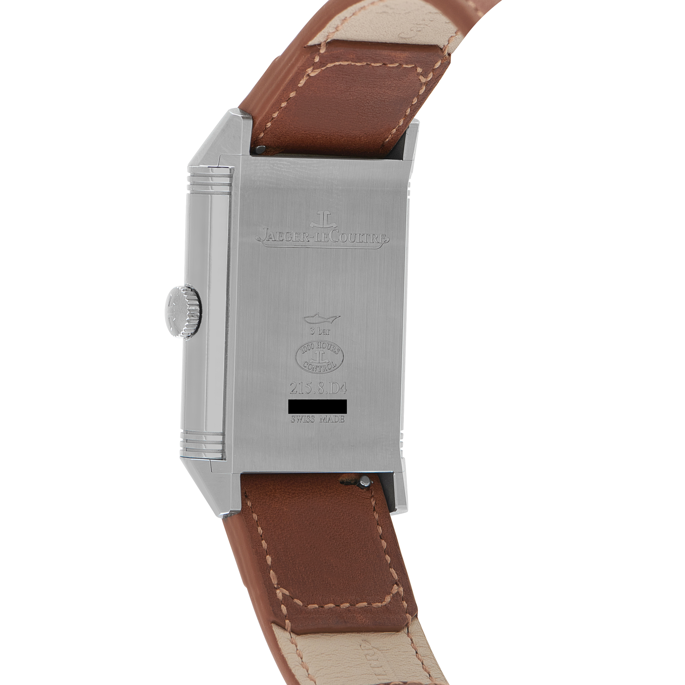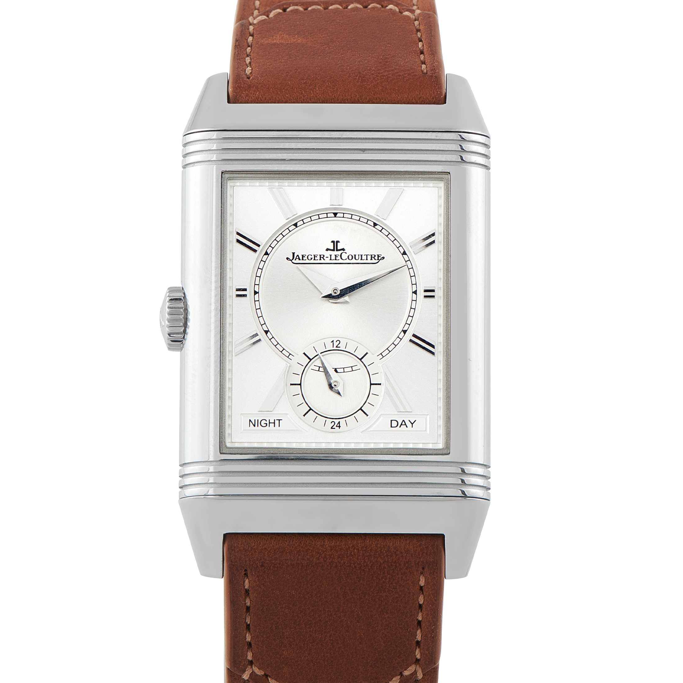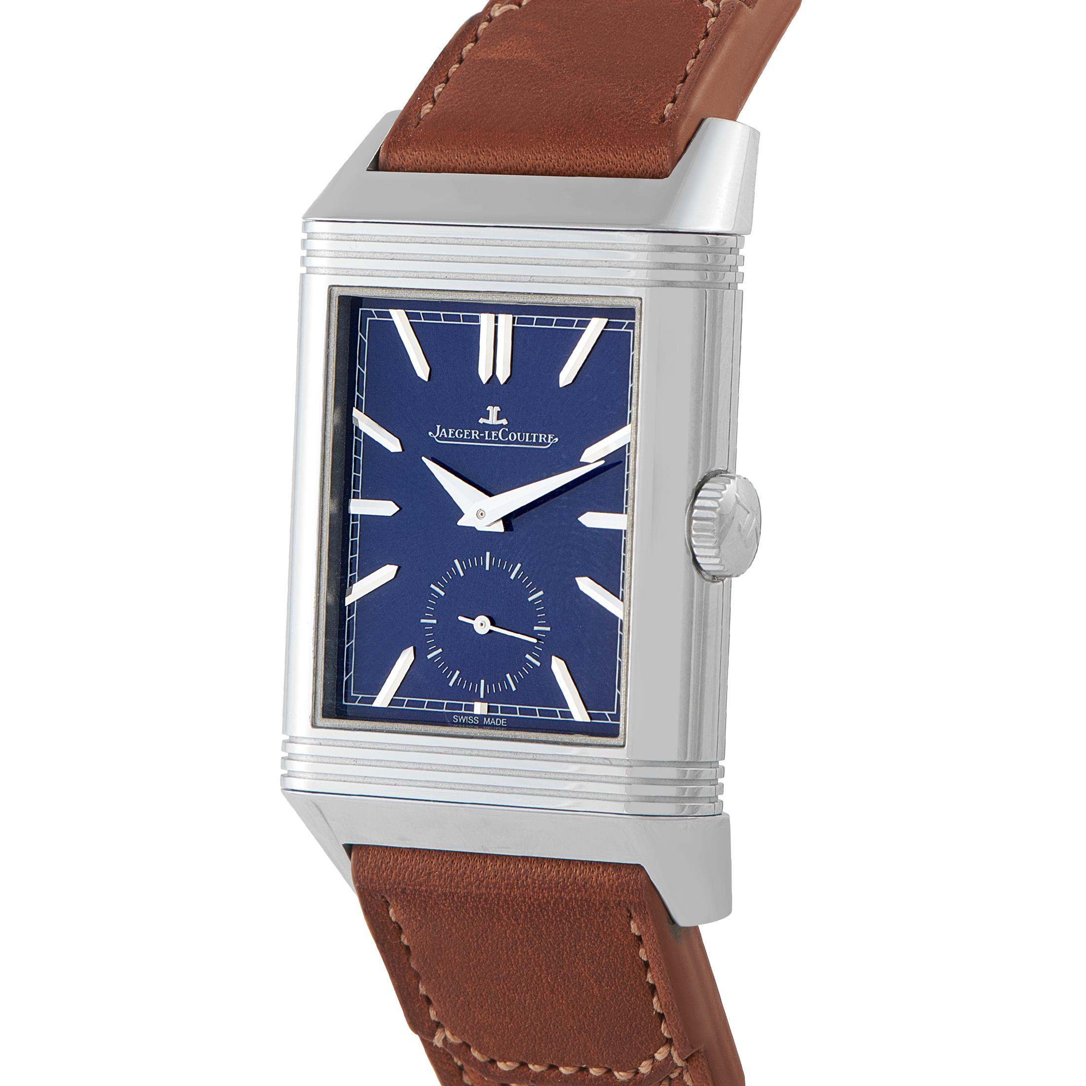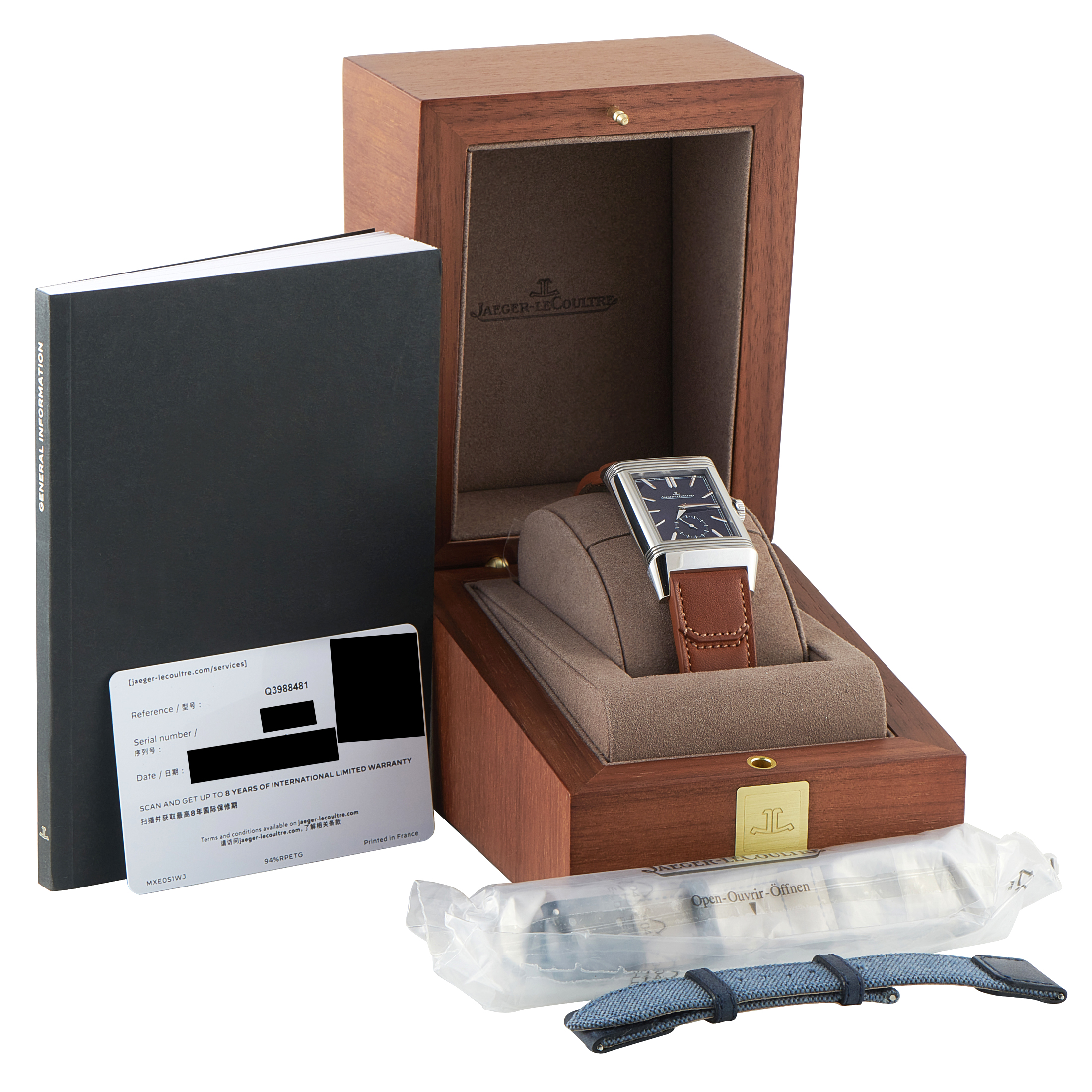 Offered pre-owned, this Jaeger-LeCoultre Reverso Tribute Duoface Small Seconds Steel Watch Q3988481 comes complete with papers, extra straps, and the manufacturer’s wooden presentation box.