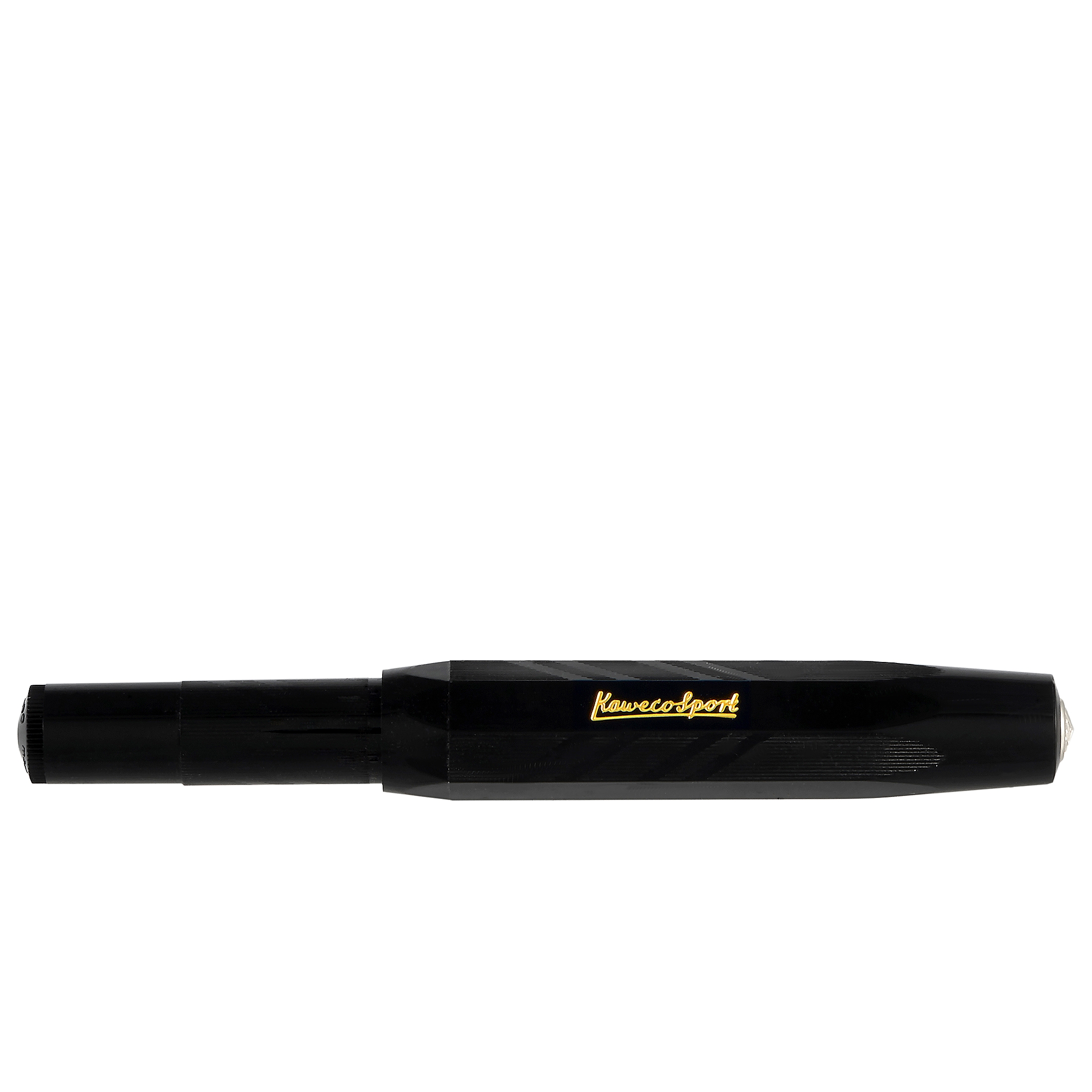 This Kaweco rollerball pen from the “Classic Sport” collection is made of plastic and presented in striking black with luxe gold-tone accents. The cap is embellished with elegant guilloché pattern featured alternately on the facets. The pen weighs 13 grams and measures 13.5 cm in length.