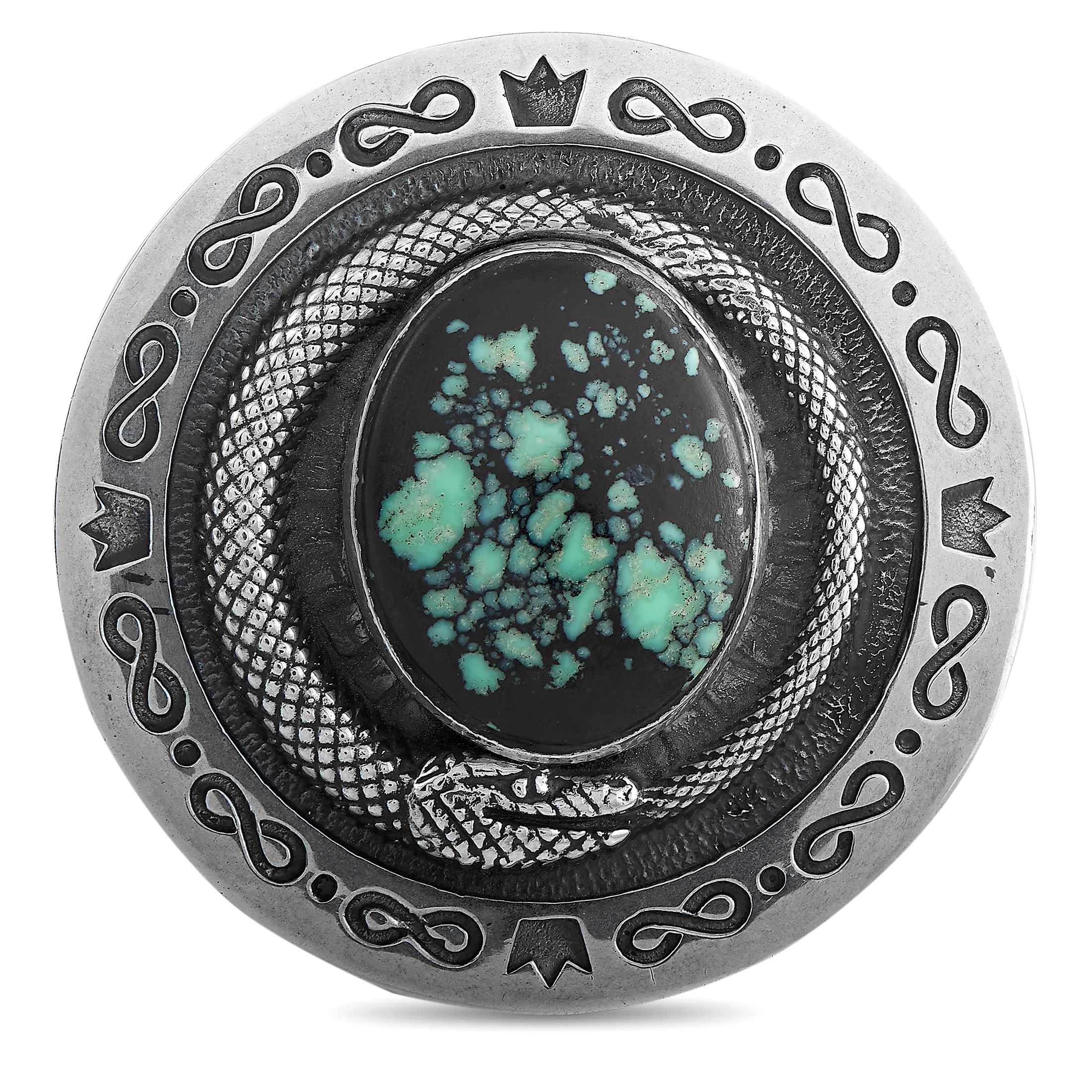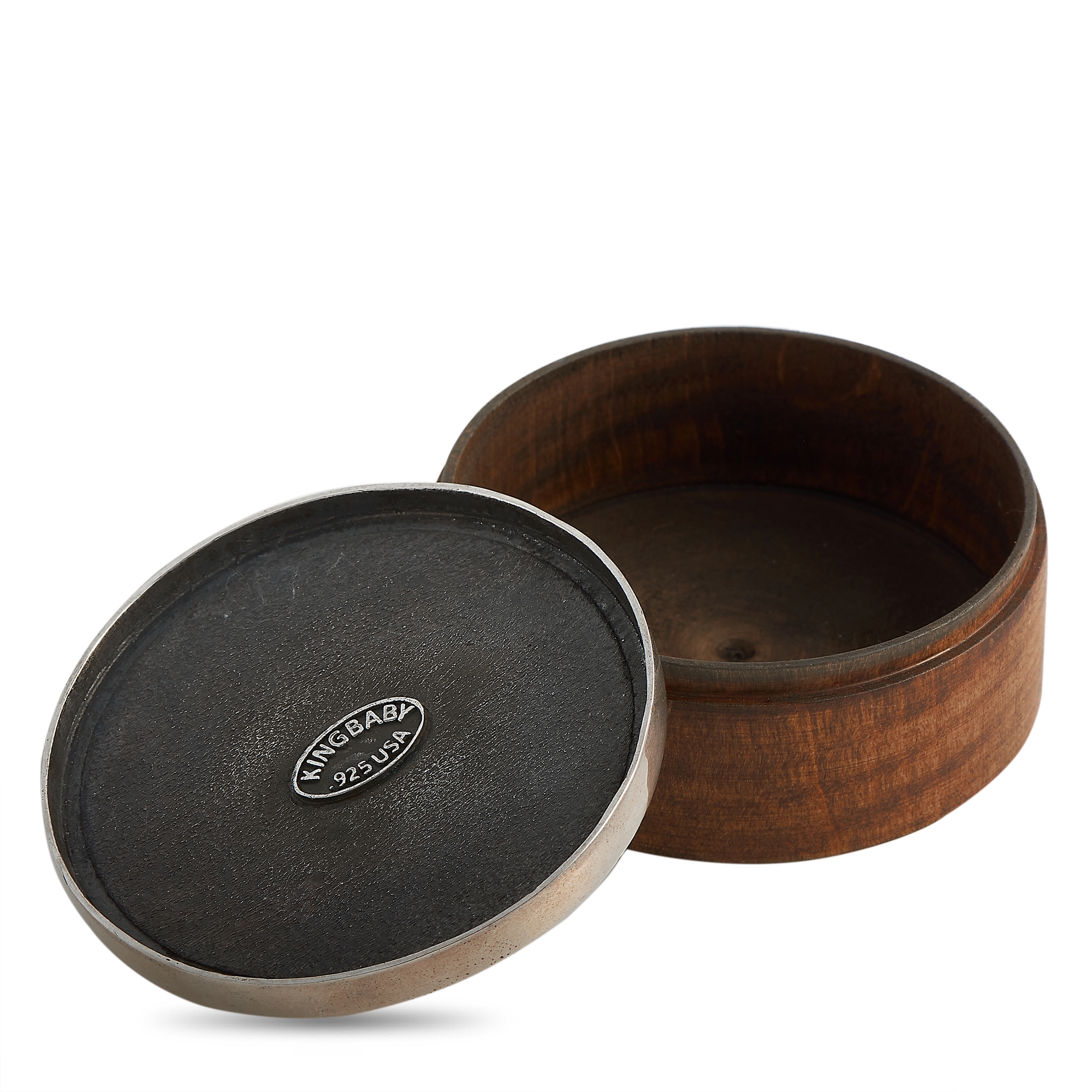 This King Baby stash box is made of bamboo wood and boasts a sterling silver lid that is set with a turquoise and features a snake motif. The box measures 2.50” in diameter and 1” in height.