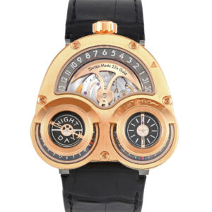 The MB&F Horological Machine No.3 is a highly complex timekeeping machine artistically designed to impress discerning luxury watch enthusiasts. Its three-dimensional 18K red gold case measures 47 x 50 x 16 mm and is fitted with a titanium caseback and an oversized crown. While the watch simply tells the time and date, it does so in an interesting manner. The top half of the watch’s face is a date disc framing the automatic rotor. At the bottom half are two goggle-like conical gauges, with the left displaying the hour and the day/night indicator, and the right showing the minute. The watch is driven by an automatic movement that has been turned upside down.