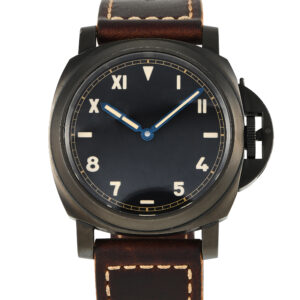 Do not let the chunky 44mm case of the masculine, modern, and military-inspired Panerai PAM00779 fool you. It’s wearable and very comfortable, especially with the Bund-like strap. The lightweight titanium case with Diamond-Like Carbon coating in matt anthracite finish is worn on a two-part strap in untreated brown leather. The leather strap has a removable cuff accessory that prevents the watch from coming into contact with the skin. This timepiece also features a brown “California” dial design, originally seen on historical Panerai models from the 40s. It has a combination of luminous Roman and Arabic numerals, bar markers, a railway minute track, and blued hands. Inside the case is the in-house caliber P.5000 that boasts an 8-day power reserve.