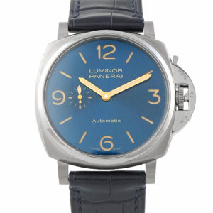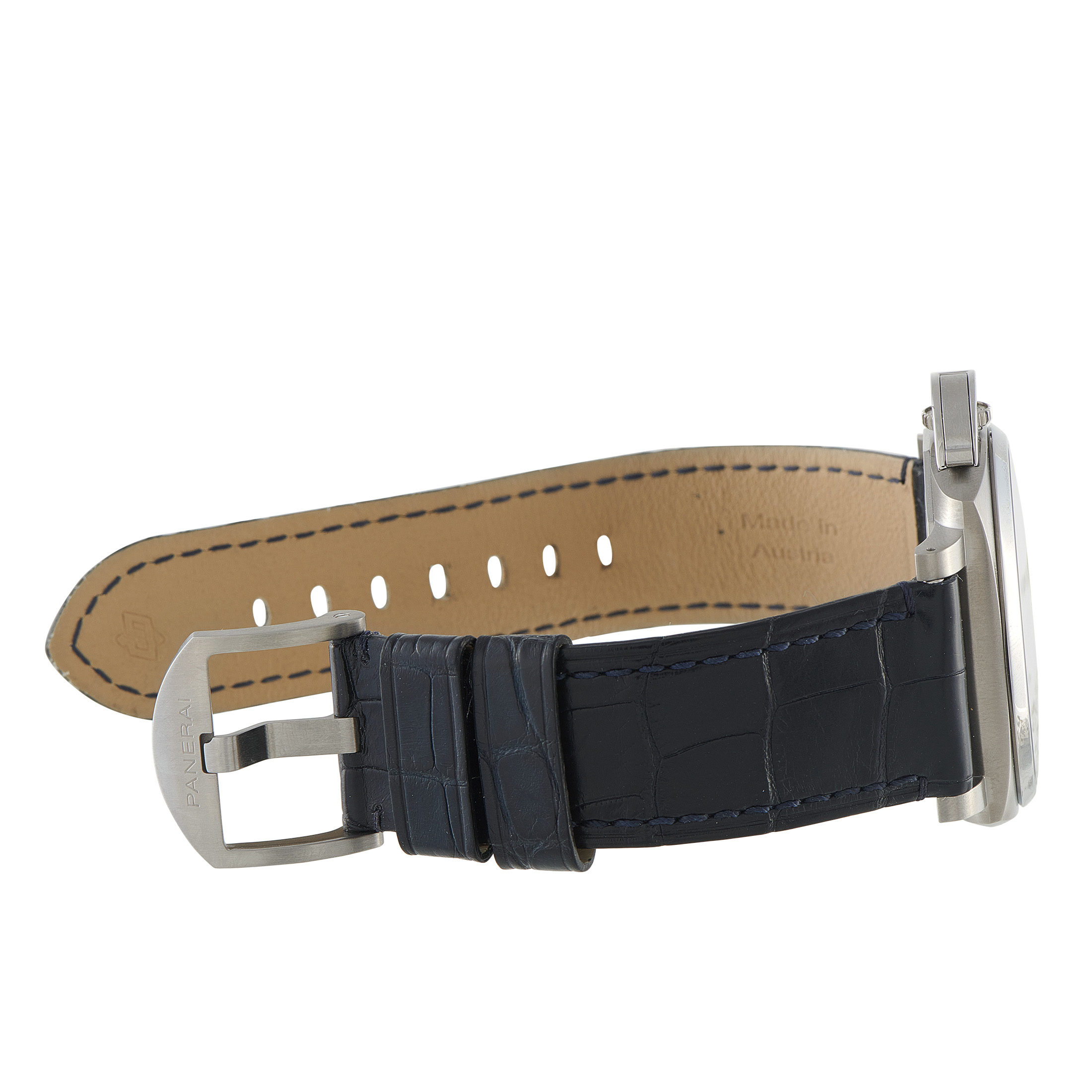 Less weight, same intent. The Panerai PAM00729 features a 45mm grade 5 titanium case to cut mass without losing presence. It runs on the P.4000, an automatic movement with an off-center tungsten micro-rotor keeps the movement flat and delivers three days of autonomy. A blue sandwich dial reveals lume through cut-out markers.
