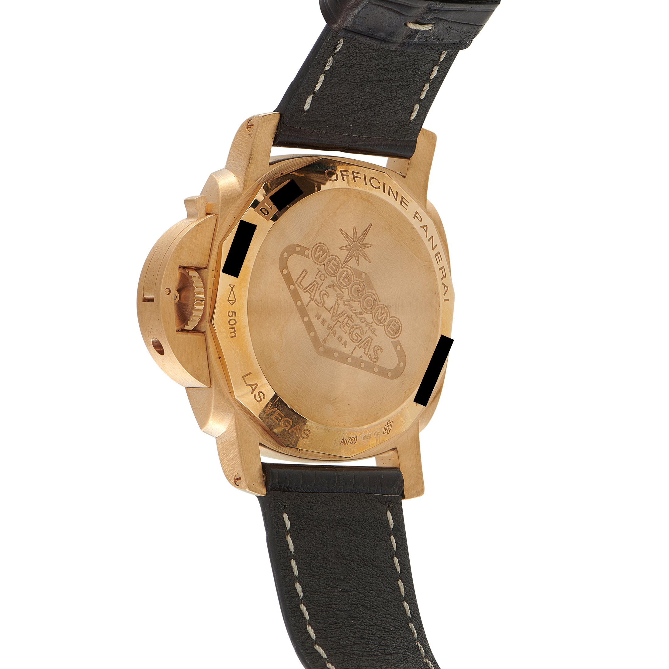 Produced in an edition of just ten pieces, the Panerai Luminor GMT 10 Days PAM00491 represents one of the brand’s most discreetly issued precious-metal references. The 18K rose gold Luminor case frames a dark brown dial configured for functional clarity, with a second timezone display and a linear power-reserve indicator. The automatic caliber P.2003 drives the watch with a 10-day power reserve. A Las Vegas-engraved caseback marks the watch as a commemorative release, identifying its status as a seldom-seen region-specific model.