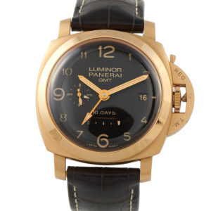 Offered pre-owned, the Officine Panerai Luminor GMT 18K Pink Gold Limited Edition Watch pam00491 comes with a gift box.