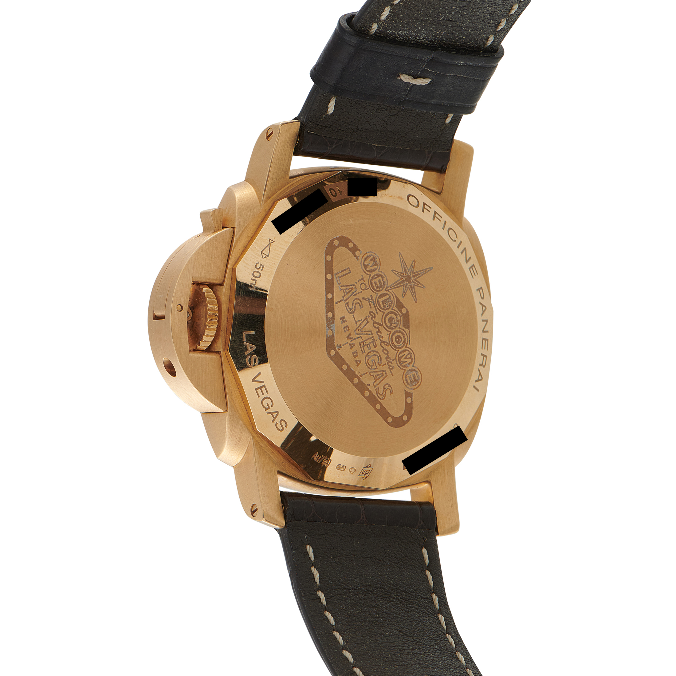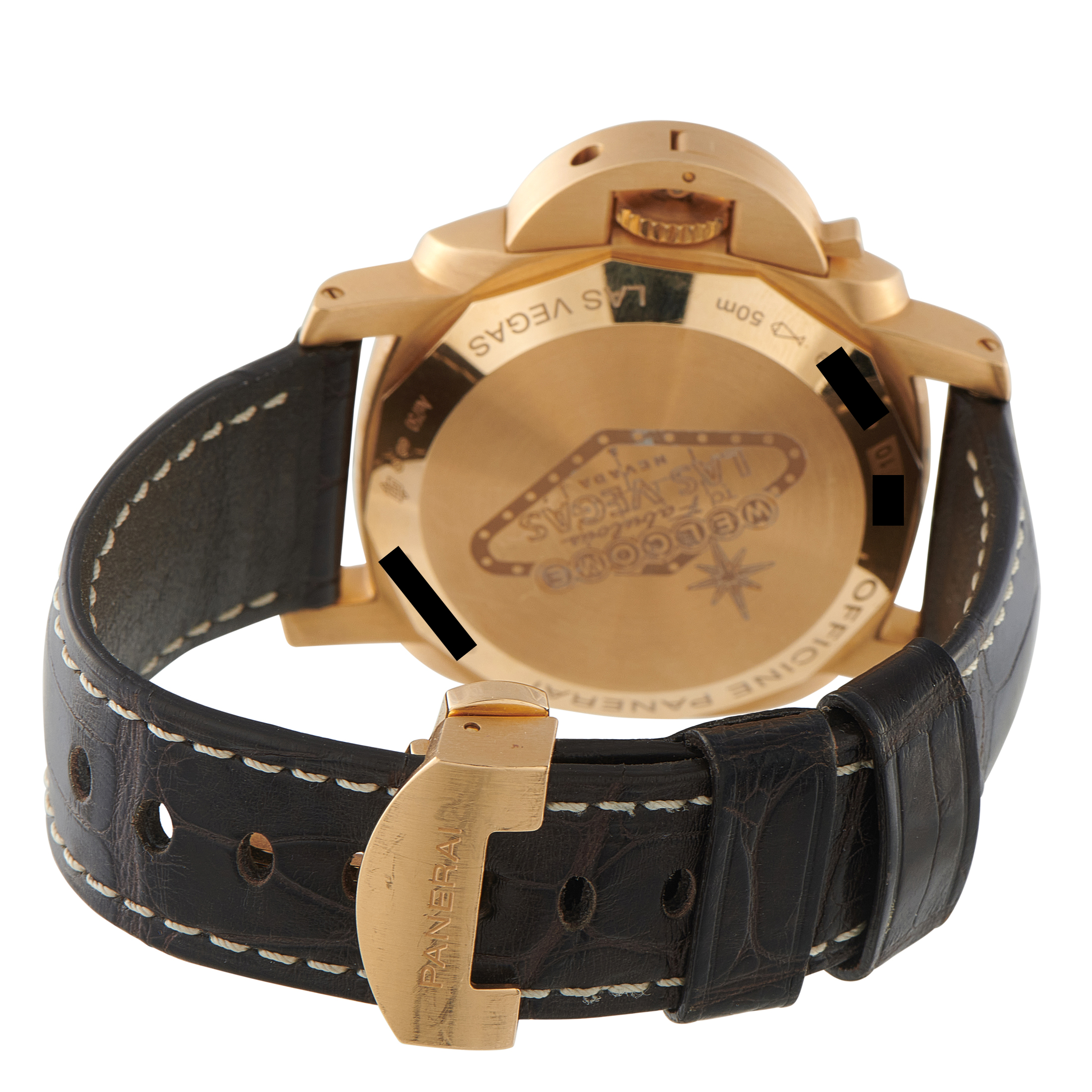 Issued in an edition of only ten pieces, this Panerai Luminor GMT PAM00491 is a rare collector’s item admired for its luxurious 18K pink gold case and impressive 10-day power reserve. The robust case carries a dark brown dial organized for direct reading, integrating a linear power reserve display and a second timezone indication. Power is supplied by the automatic P.2003 caliber featuring three barrels and 296 components. A Las Vegas-engraved caeback identifies this model as a boutique-specific commemorative release, placing it among Panerai’s most limited references.