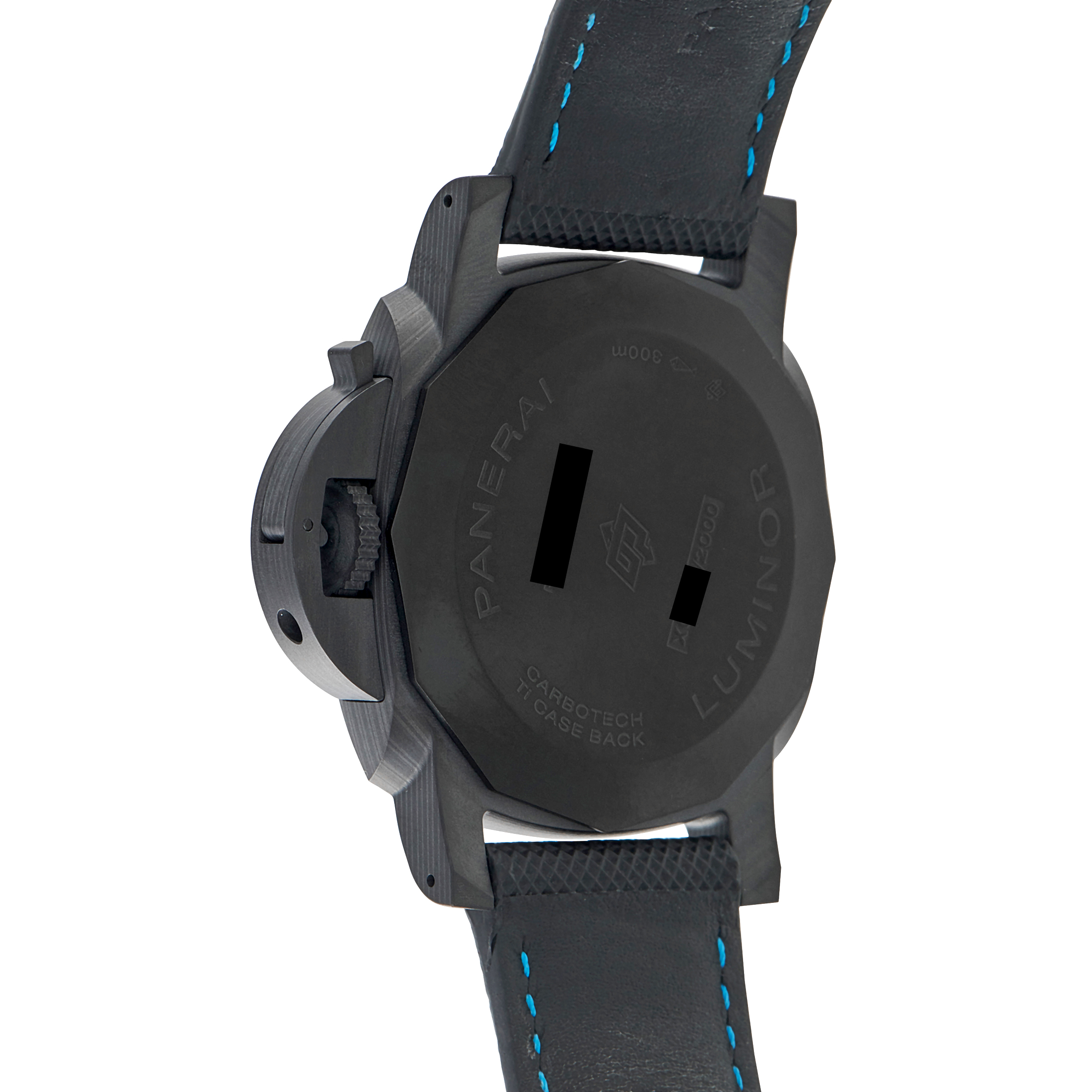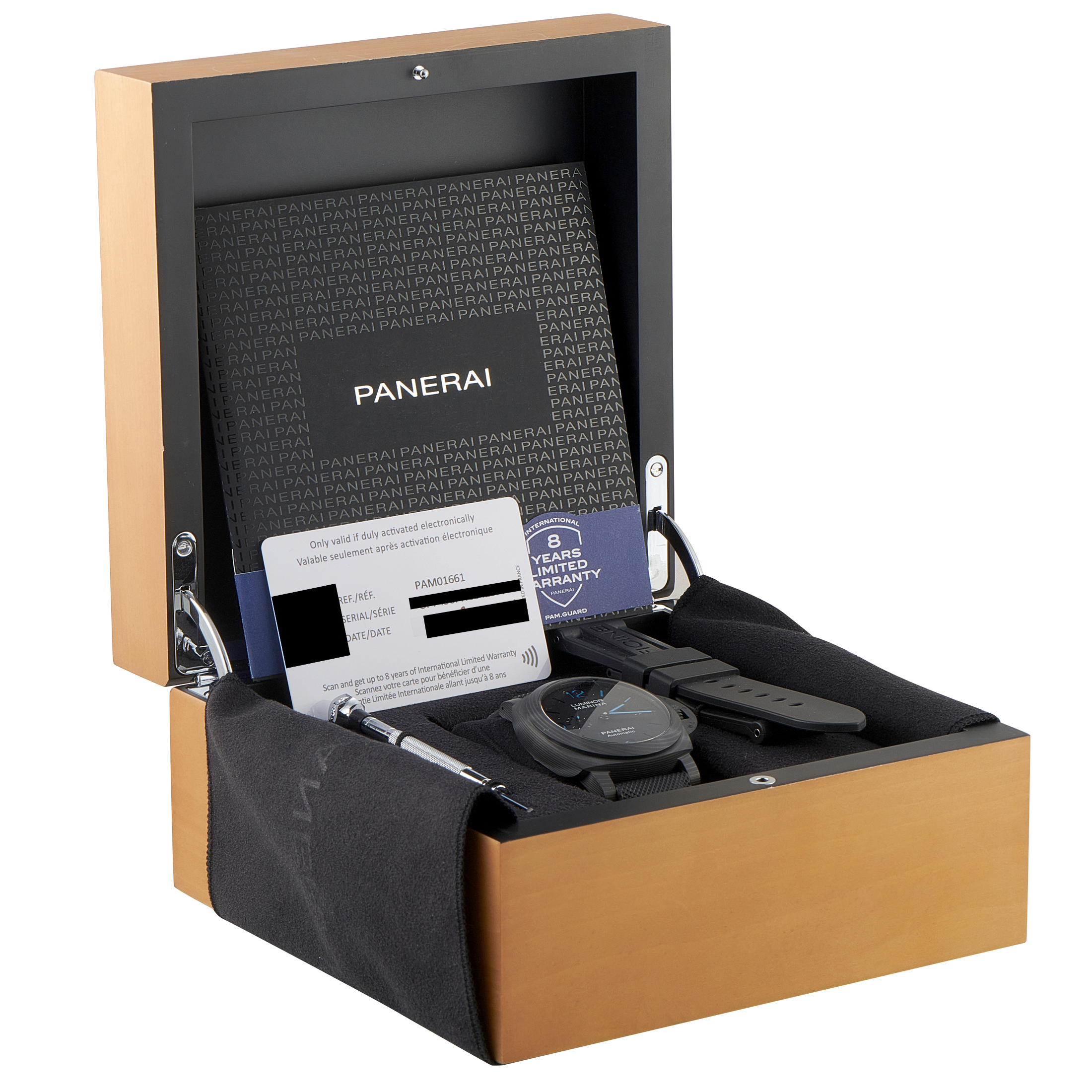 Offered pre-owned, this Officine Panerai Luminor Marina Carbotech™ Watch pam01661 comes with papers, extra strap, a strap changing tool, and the manufacturer’s box.