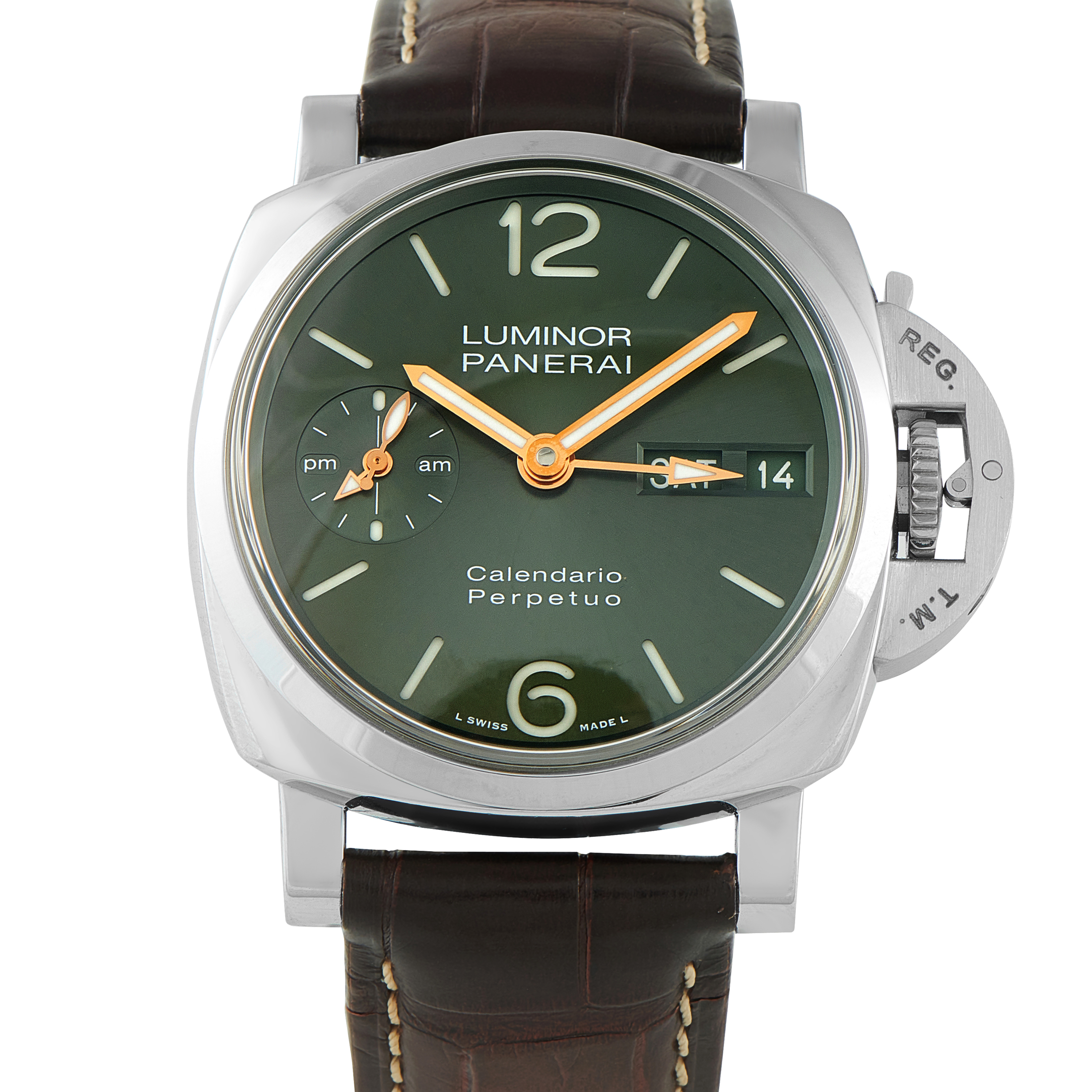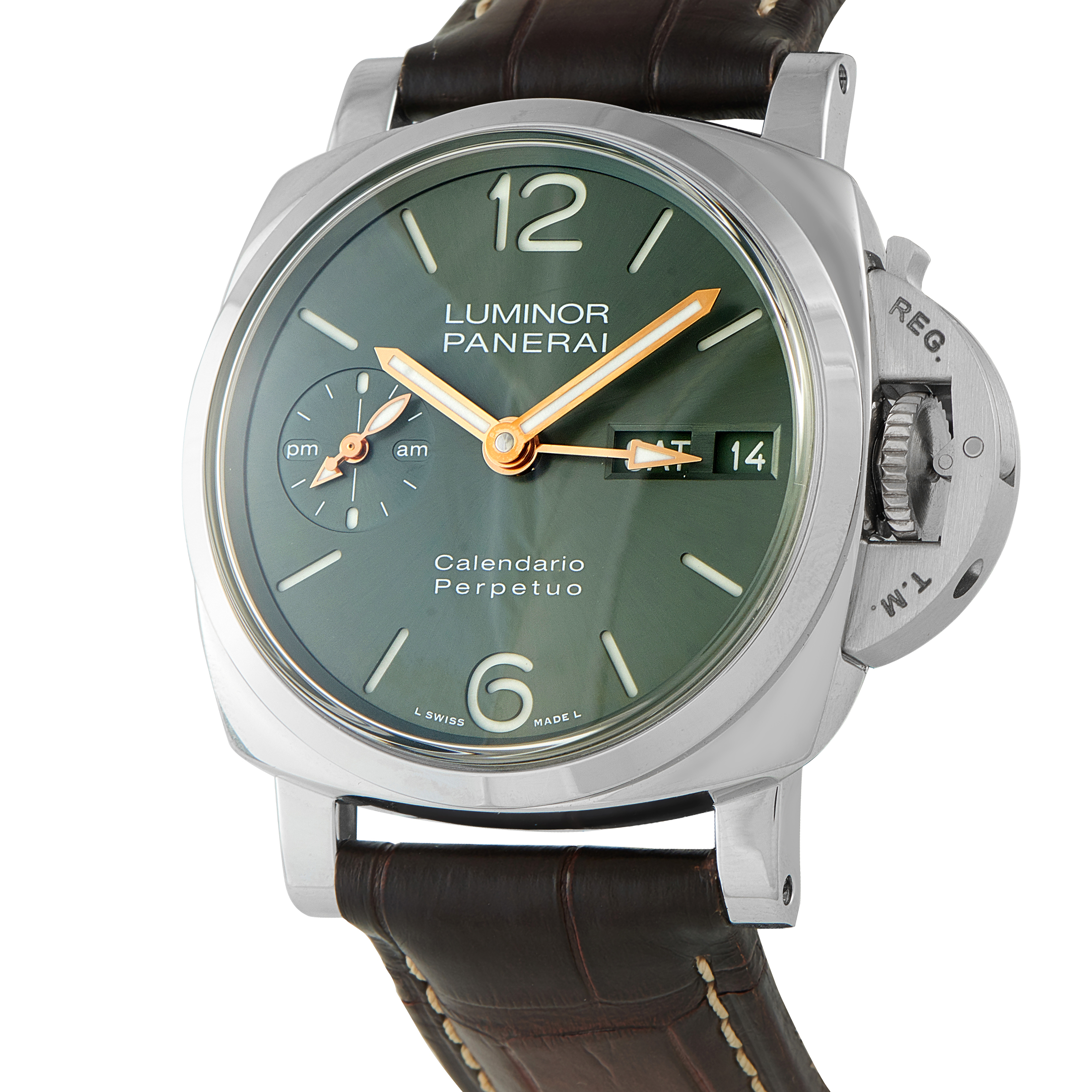 The Panerai Luminor Perpetual Calendar GMT ref. PAM00715 is a limited edition timepiece showcasing a 44mm case made of Platinumtech™. It houses the automatic P.4100 caliber that packs a perpetual calendar, GMT, leap-year, month indicators, and small seconds. The dial is green sun-brushed with luminous hour markers and hands. At 3 o’clock are the date and day apertures, while at 9 o’clock is a combined second time zone and small seconds. Power reserve lasts approximately 3 days and water resistance is 50 meters. The watch is worn on a brown leather strap, secured by a tang buckle.