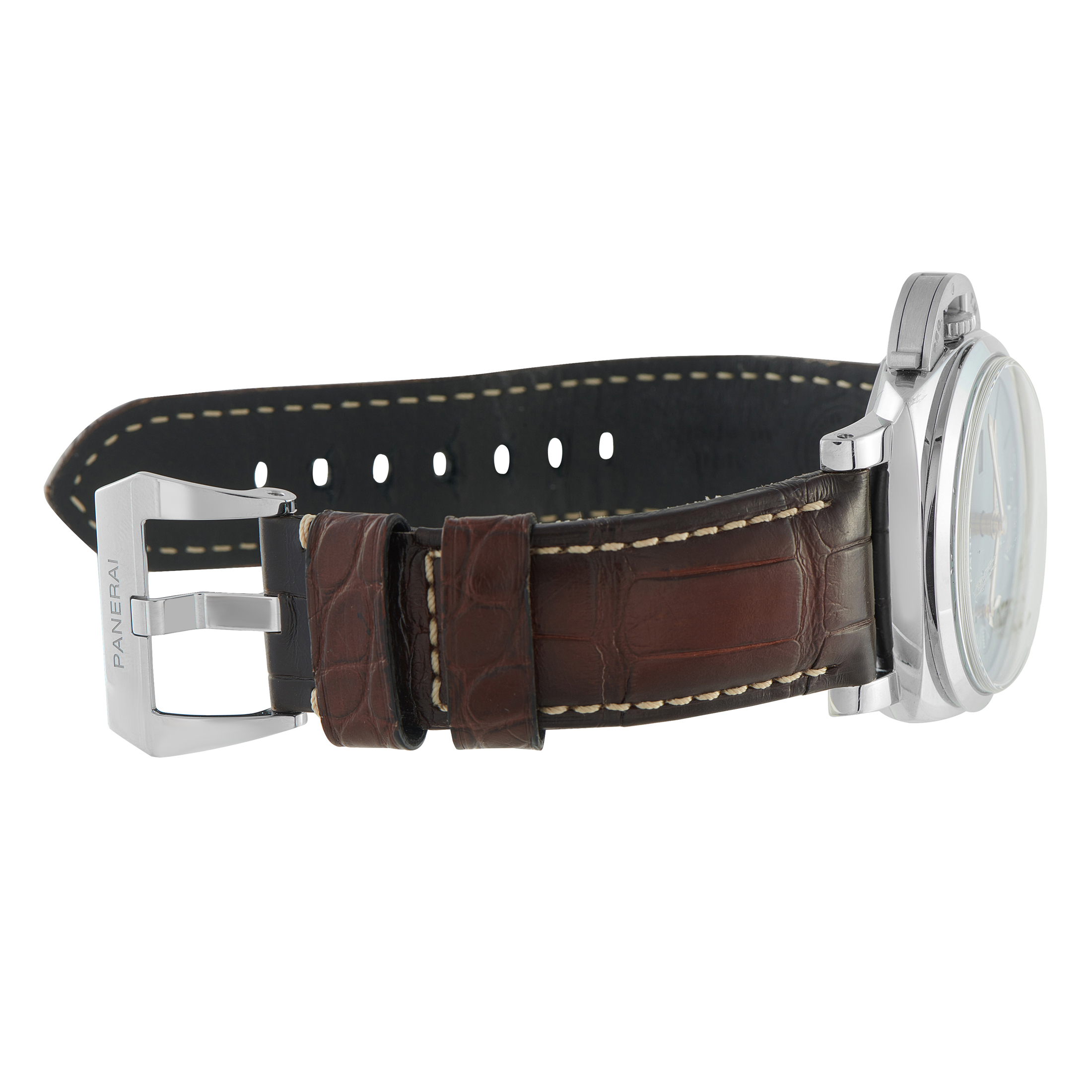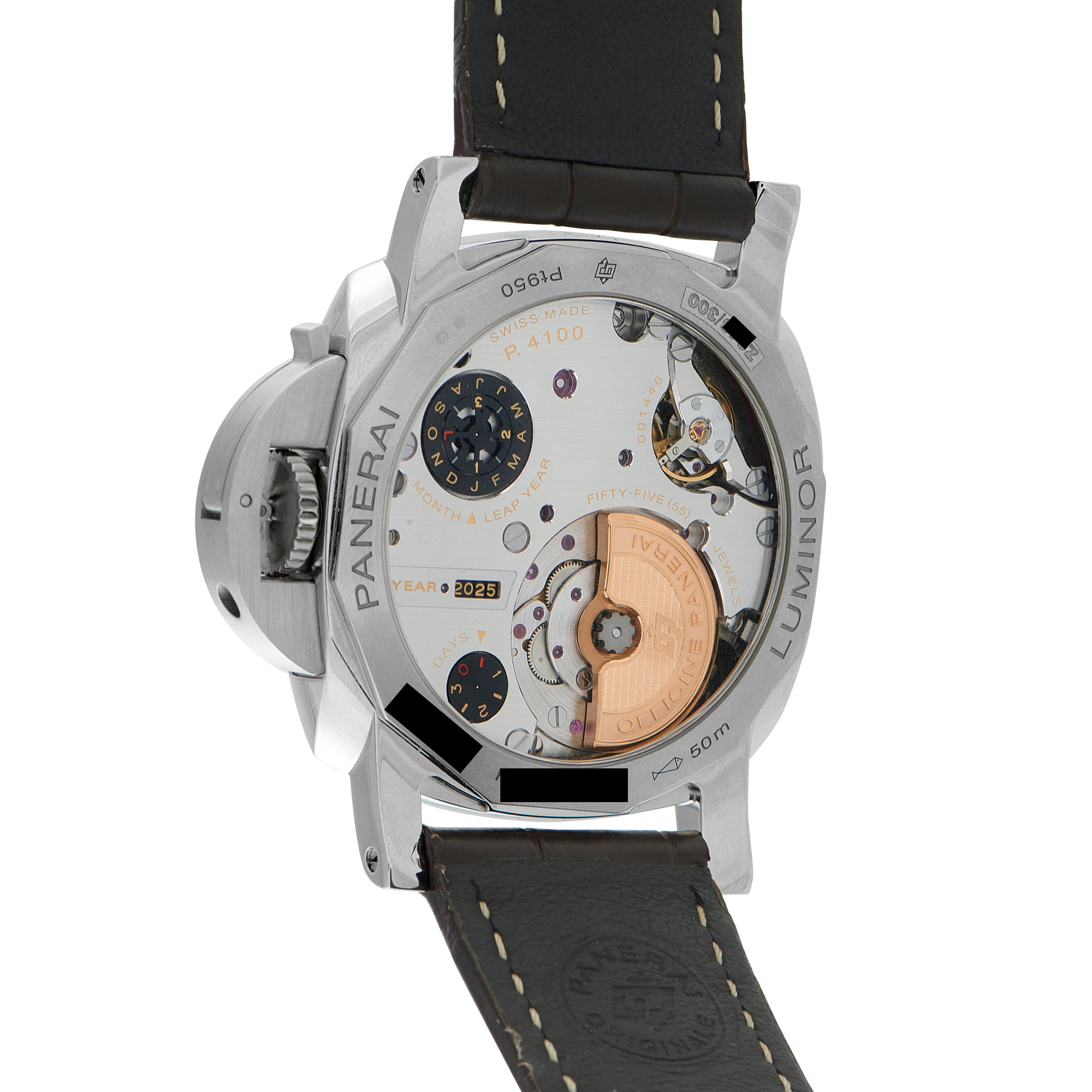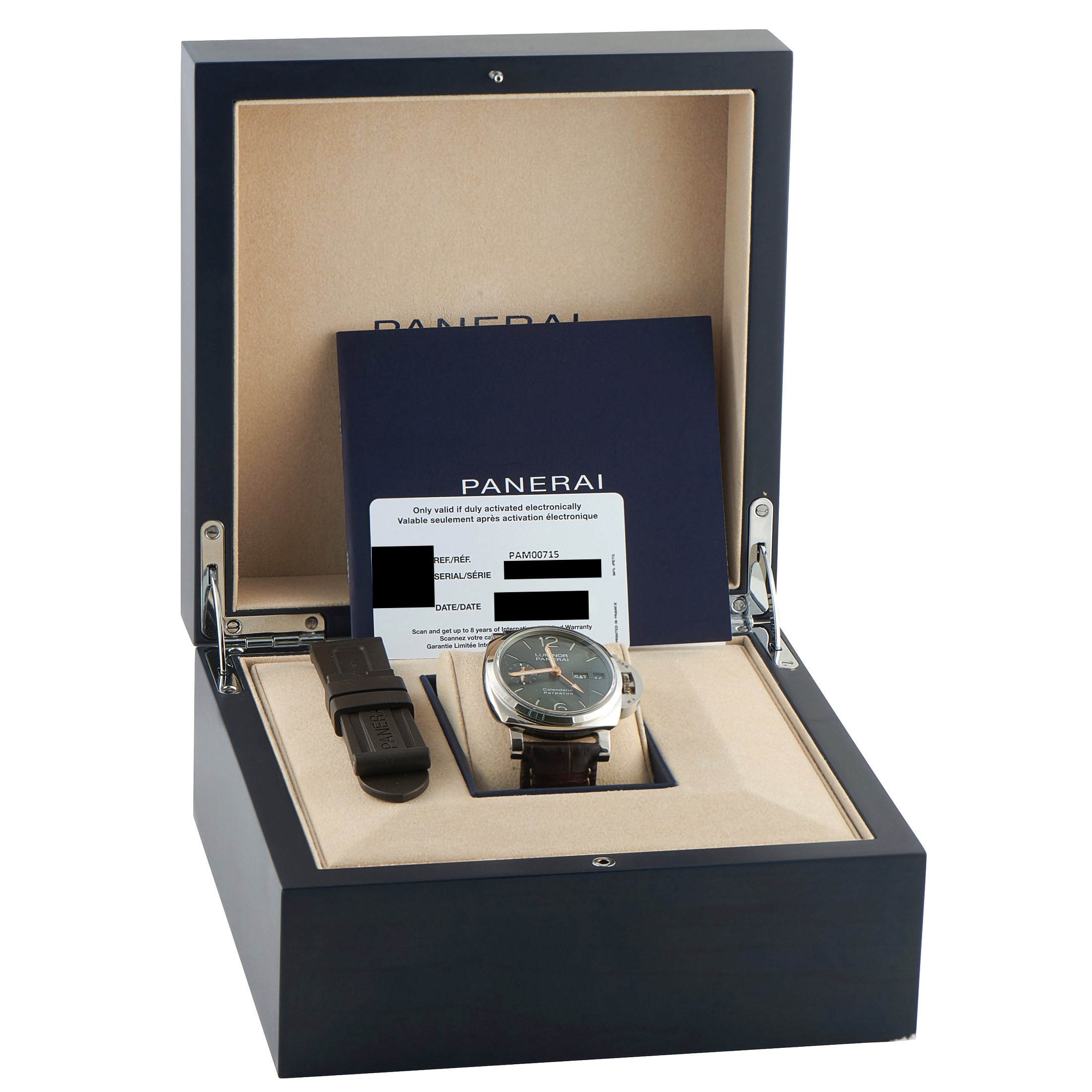 Offered unworn, this Officine Panerai Luminor Perpetual Calendar GMT Platinumtech Watch PAM00715 comes with papers, extra strap, and the manufacturer’s box.