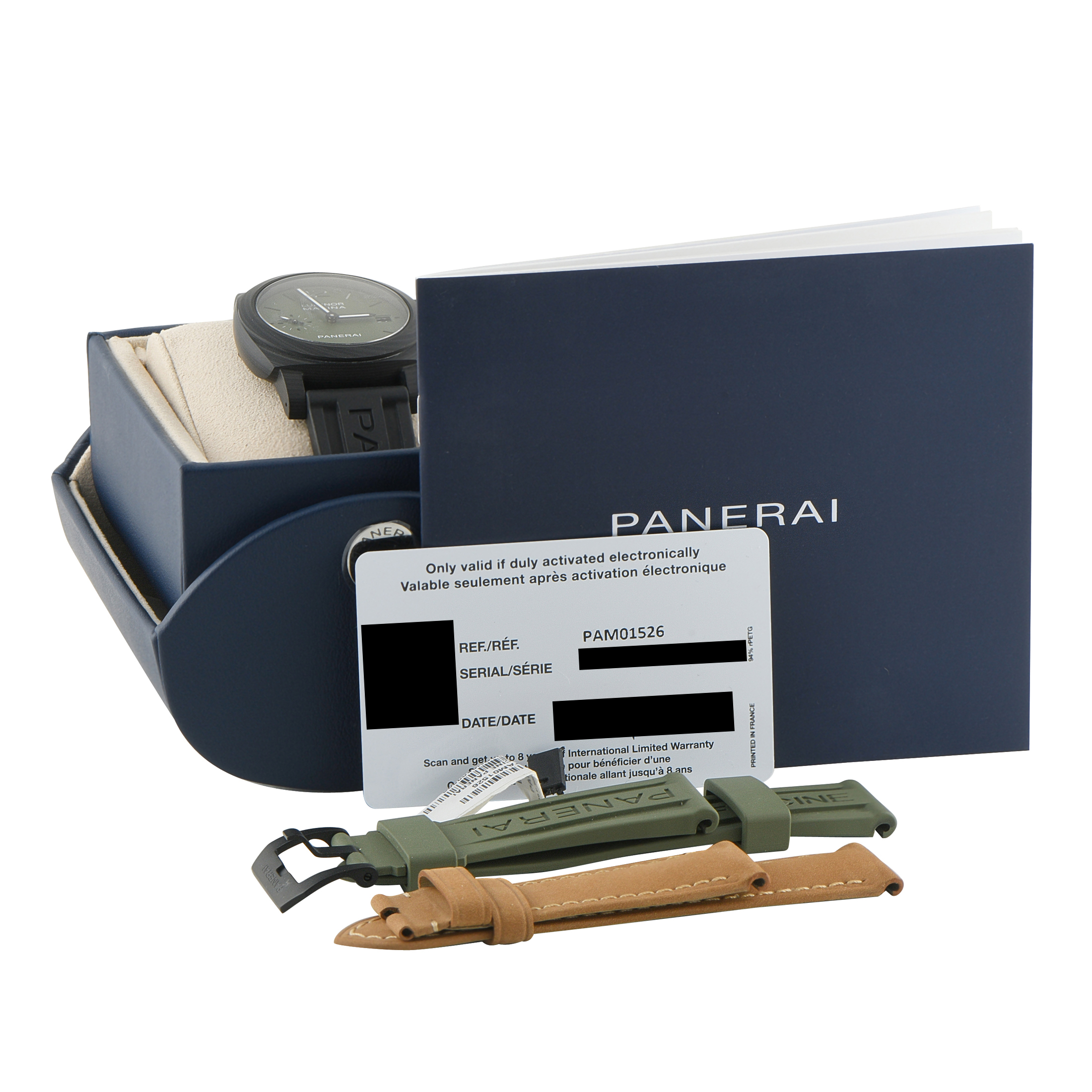 This pre-owned Officine Panerai Luminor Quaranta Carbotech Watch PAM01526 is accompanied by papers, extra straps, and the manufacturer’s box.