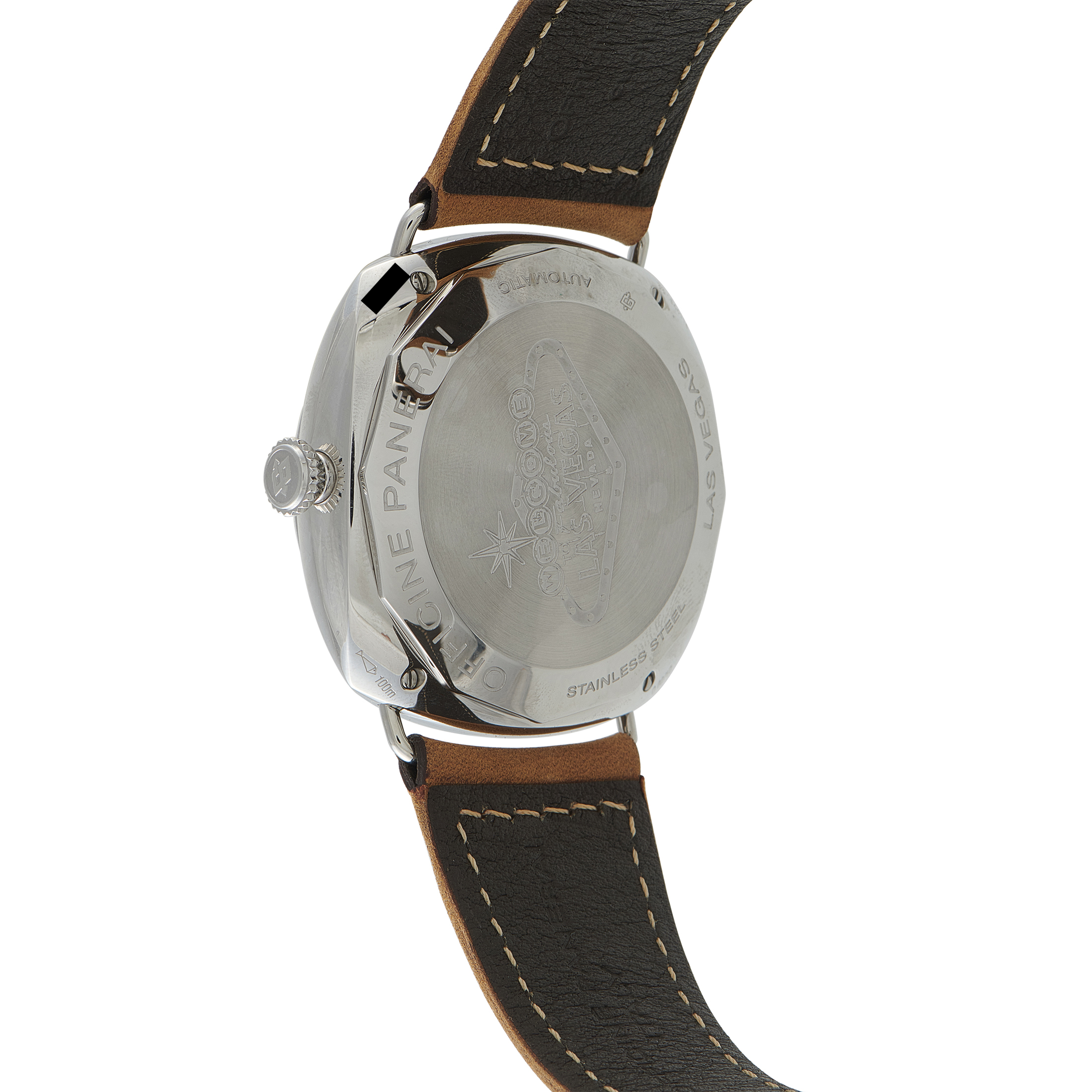 Panerai produced the PAM00479 in a very limited run for the Las Vegas boutique, making it a rare reference valued for its scarcity and for housing the brand’s 10-day automatic GMT movement in a stainless steel Radiomir case. The watch combines extended mechanical autonomy with a restrained dial layout, featuring a second timezone display and linear power-reserve indicator without disrupting balance or readability. Fitted with a suede leather strap, this reference demonstrates Panerai’s application of long-duration calibers within traditional case designs suited to regular wear.