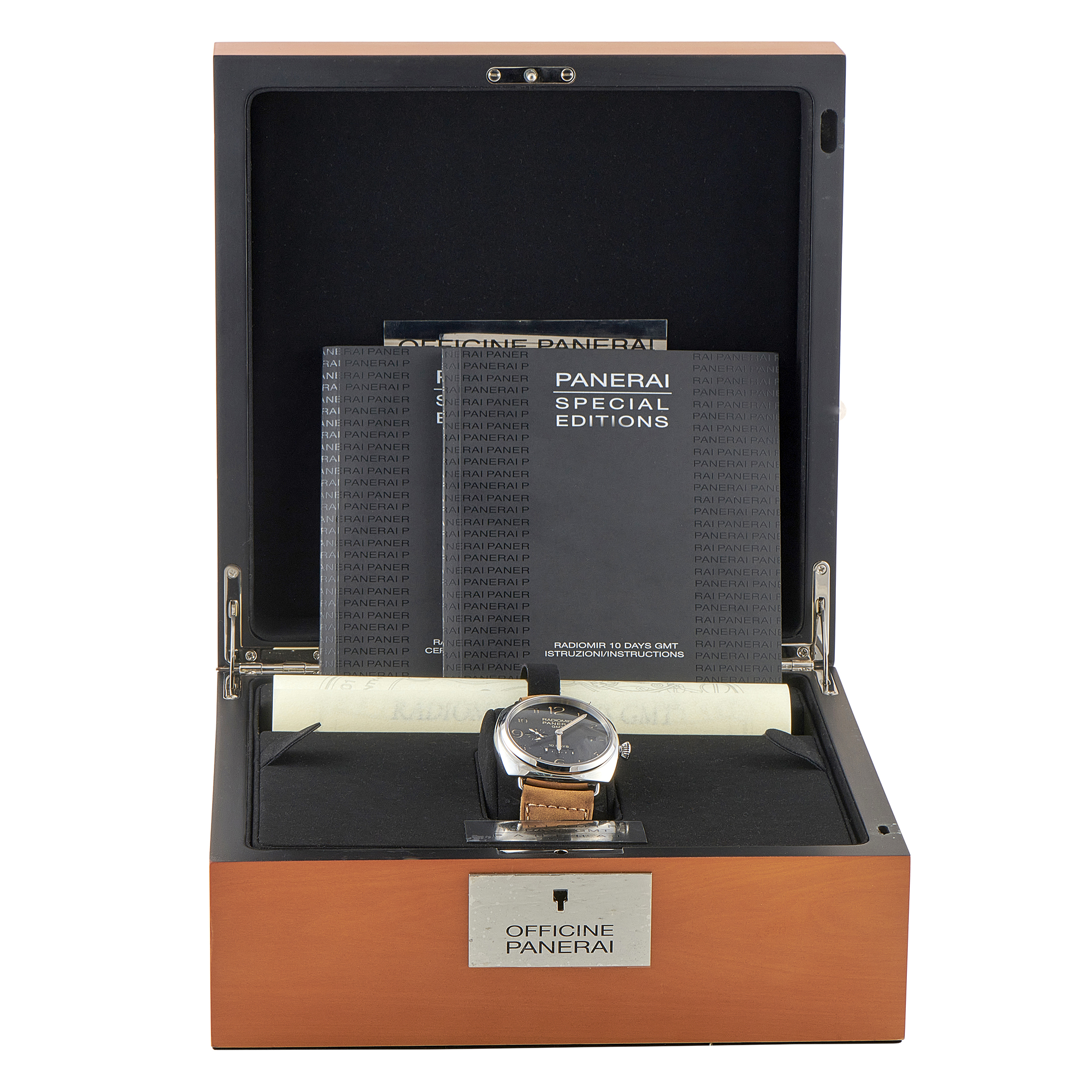 Offered pre-owned, the Officine Panerai Radiomir 10 Days GMT Steel Watch pam00479 comes with papers and the manufacturer’s presentation box.