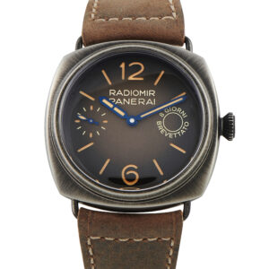 The Officine Panerai Radiomir Otto Giorni PAM01347 in 45mm Brunito eSteel™ blends vintage-inspired styling with sustainable innovation. The cushion-shaped case is made from recycled steel, hand-finished to achieve an aged look. It is complemented by a minimal layout dial with the hour, minute, and small seconds on a gradient brown backdrop. Luminous Arabic numerals and hour markers ensure superb legibility. Powering this watch is the hand-wound P.5000 Caliber, which offers an impressive 8-day (192 hours) power reserve.