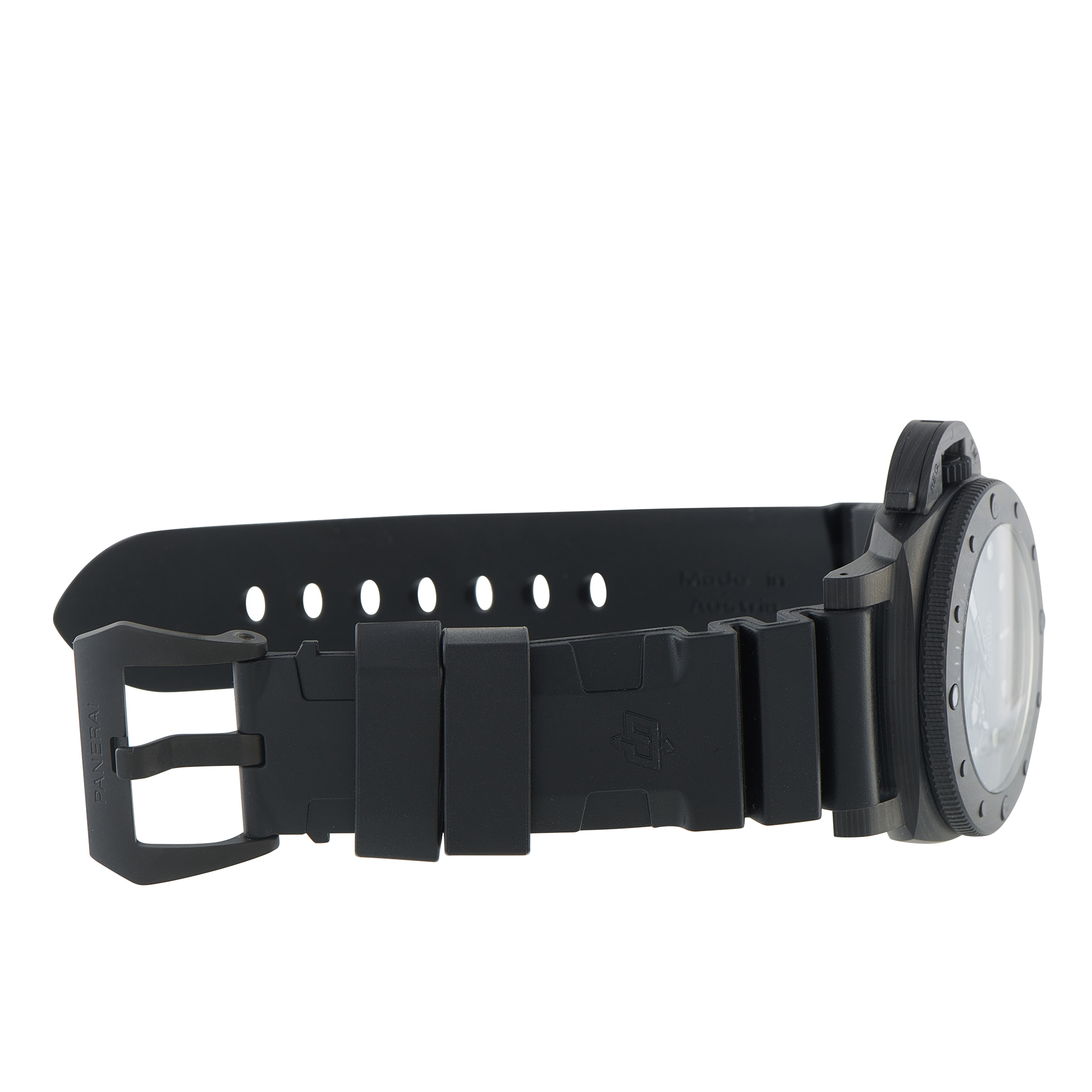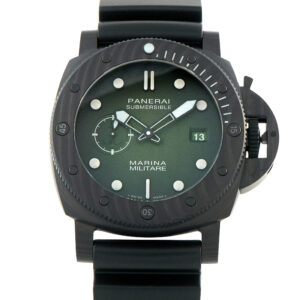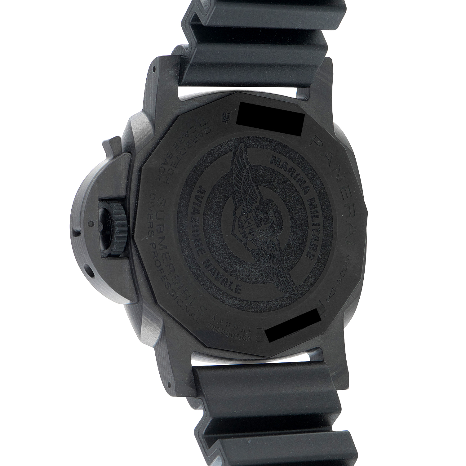 Papers, a secondary strap, and the manufacturer’s box accompany this unworn Officine Panerai Submersible Marina Militare Carbotech Watch PAM01698.