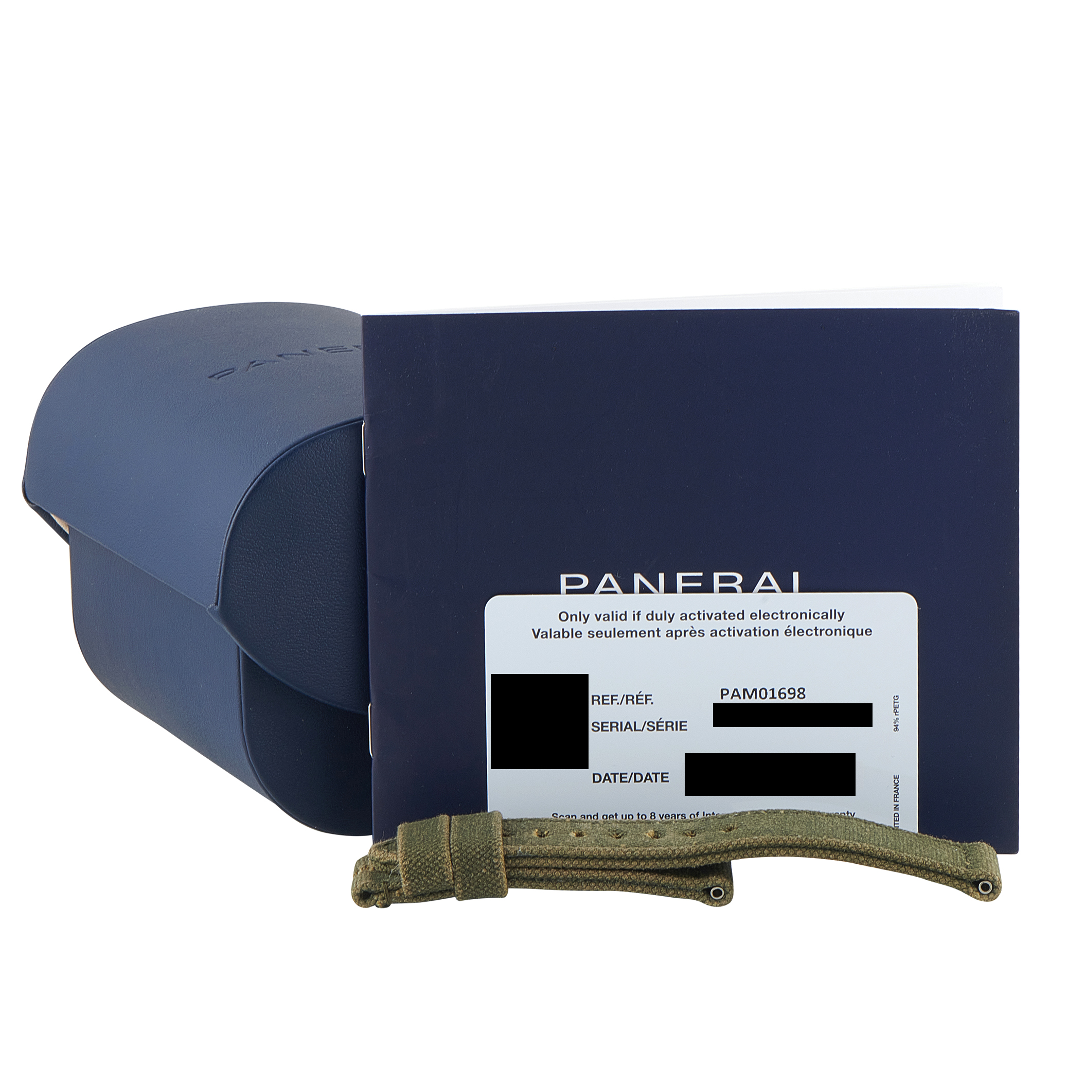One to keep on your radar if military-coded tool watches sit high on your list. The PAM01698 integrates specific tactical cues into the Submersible platform. Its small seconds sub-dial at 9 o’clock features a radar-style display. Unlike standard matte dials, this piece has a grained fumé finish that transitions from deep green to black at the perimeter, providing a high-contrast backdrop for the grey Super-LumiNova markers. Its P.900 automatic caliber provides three days of energy and manages a date window at 3 o’clock. The movement is housed in a 44mm Carbotech™ case that is lighter and more resilient than steel.