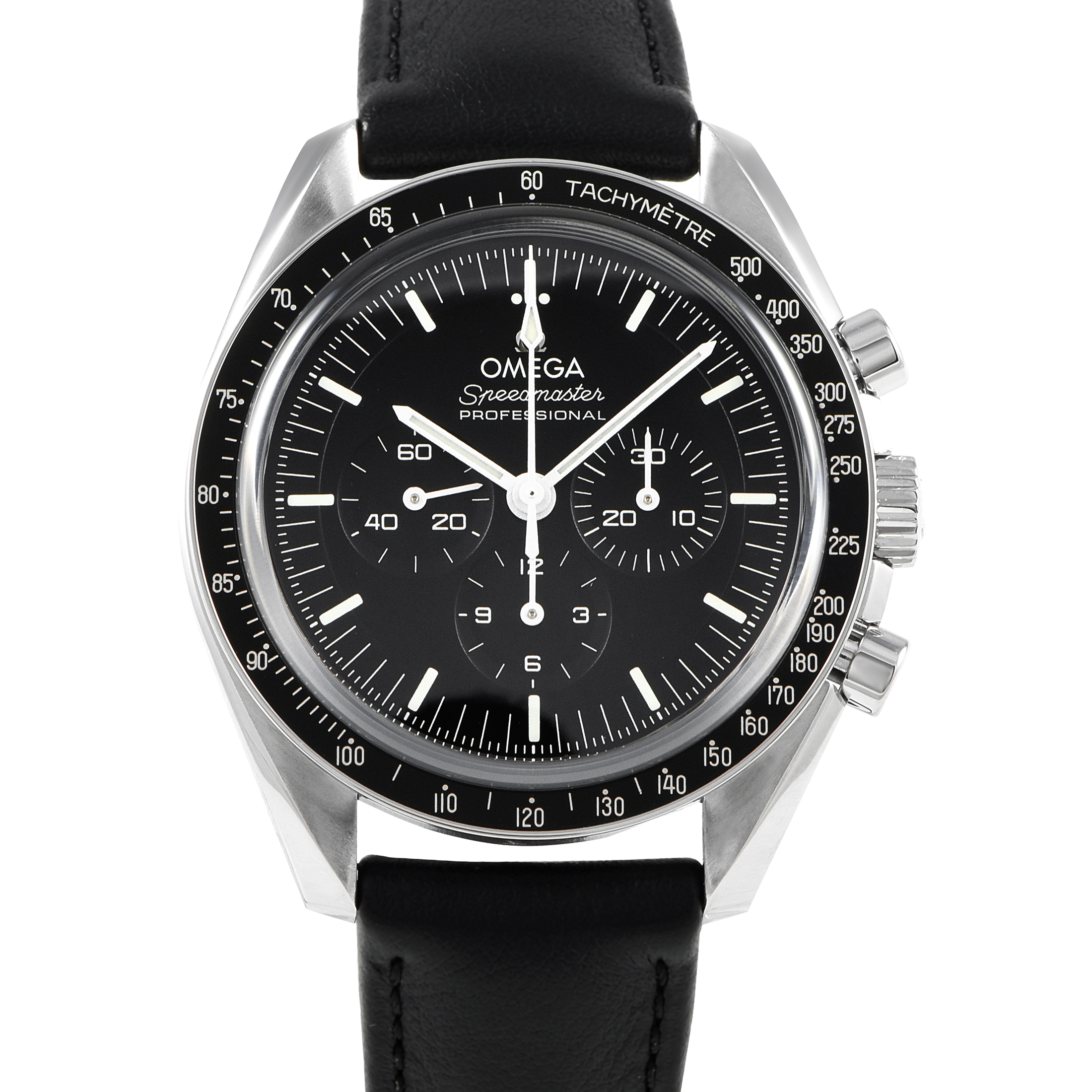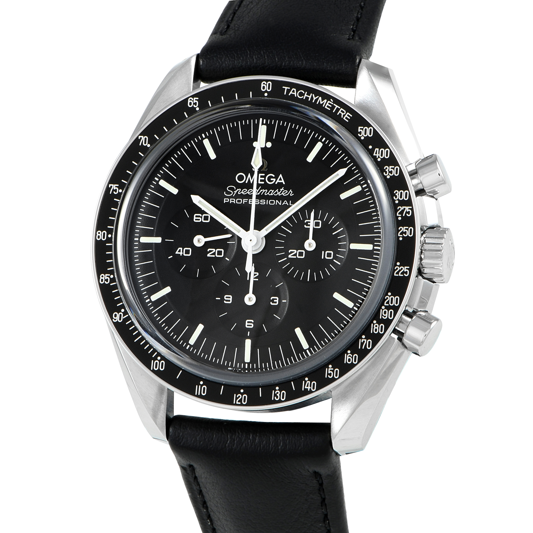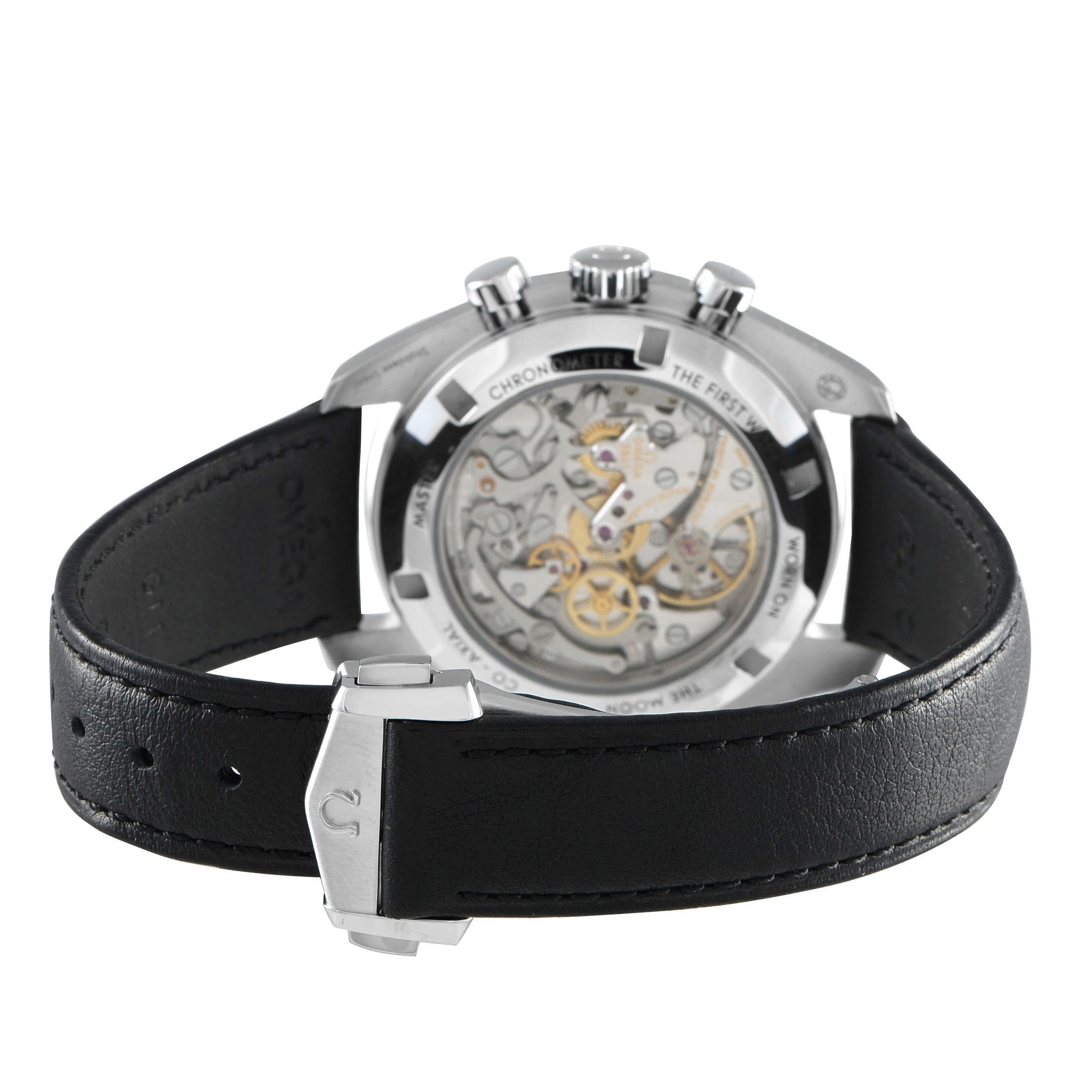 A steel-on-leather Speedmaster with a sapphire sandwich construction. This OMEGA Speedmaster ref.310.32.42.50.01.002 features a 42mm case with the front and back protected by a sapphire crystal. The case houses the OMEGA Co-Axial Master Chronometer Caliber 3861. The METAS-certified manual-winding movement offers 50 hours of power reserve. This watch also features a matte black stepped dial with three sub-dials, luminous hands and index hour markers. Its bezel has the classic black anodized aluminum insert. Seasoned collectors will appreciate the bezel insert that features the “dot over ninety” and the “dot diagonal to 70.”