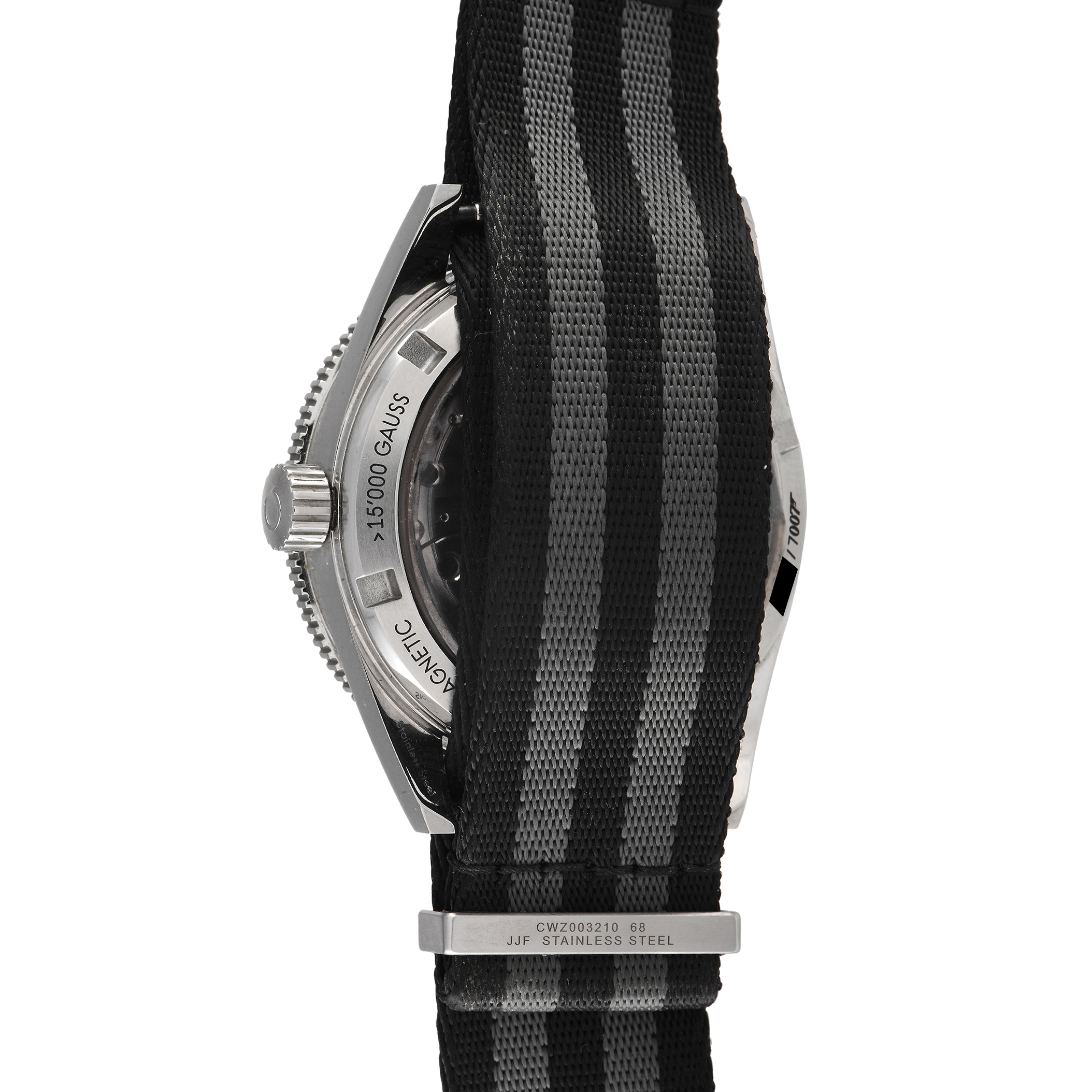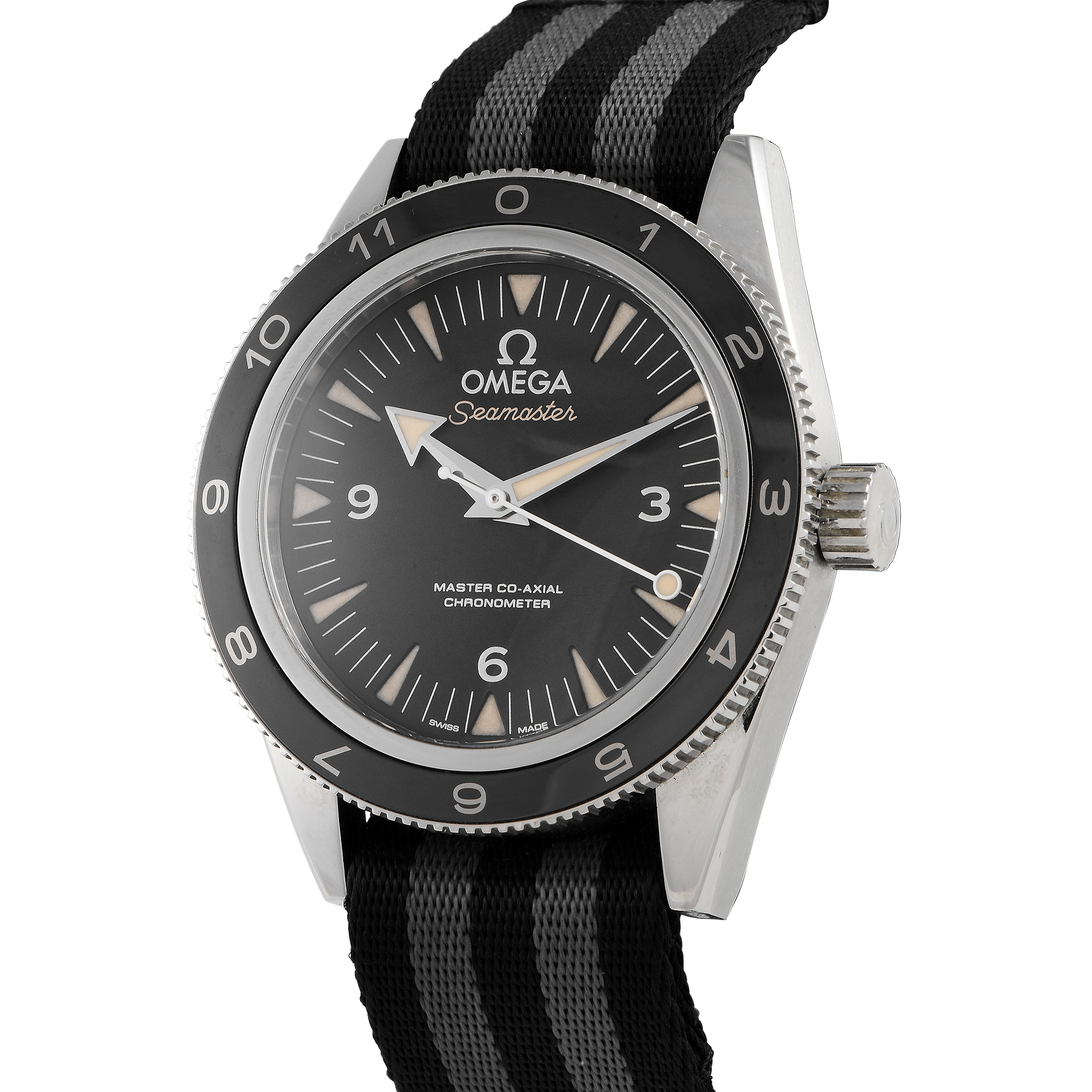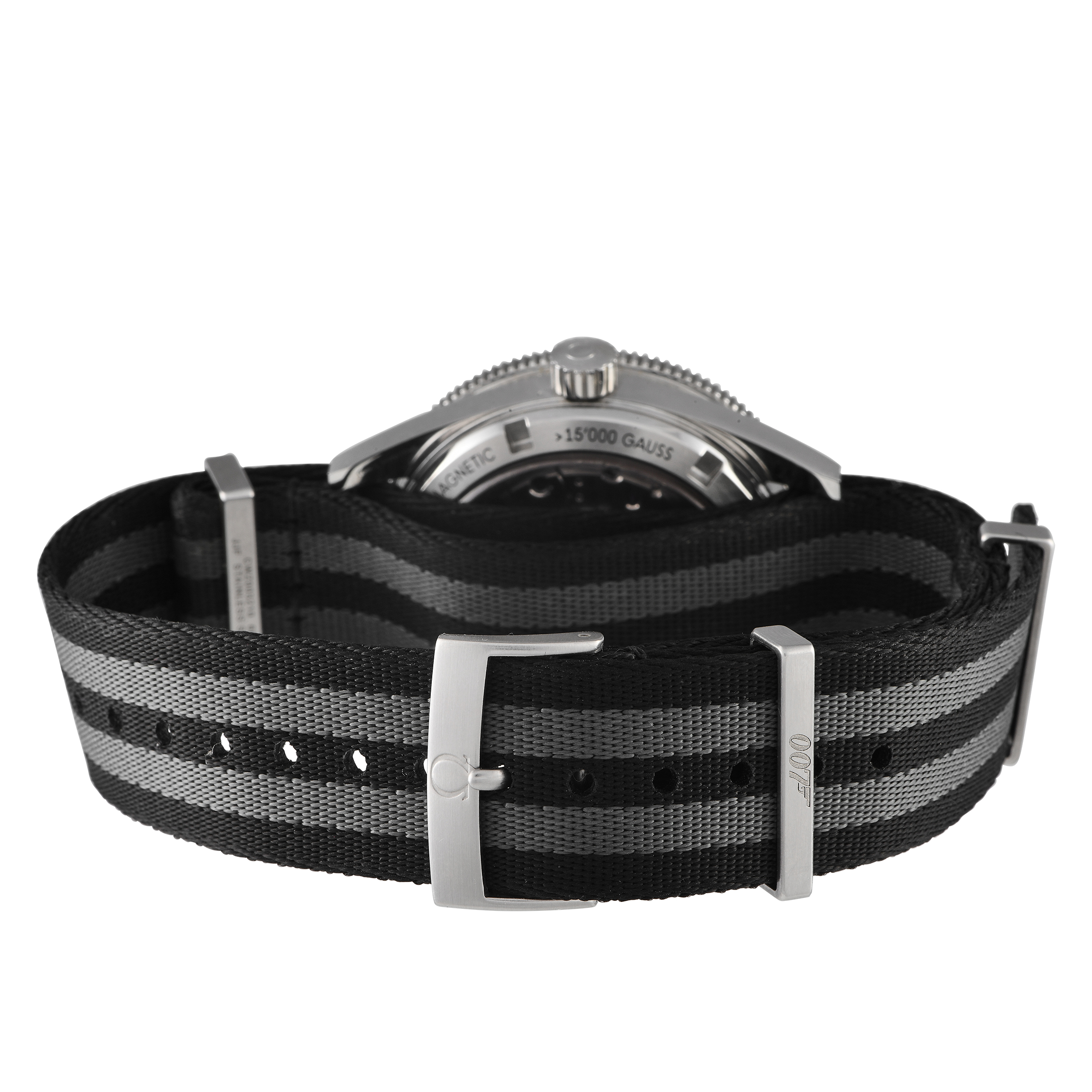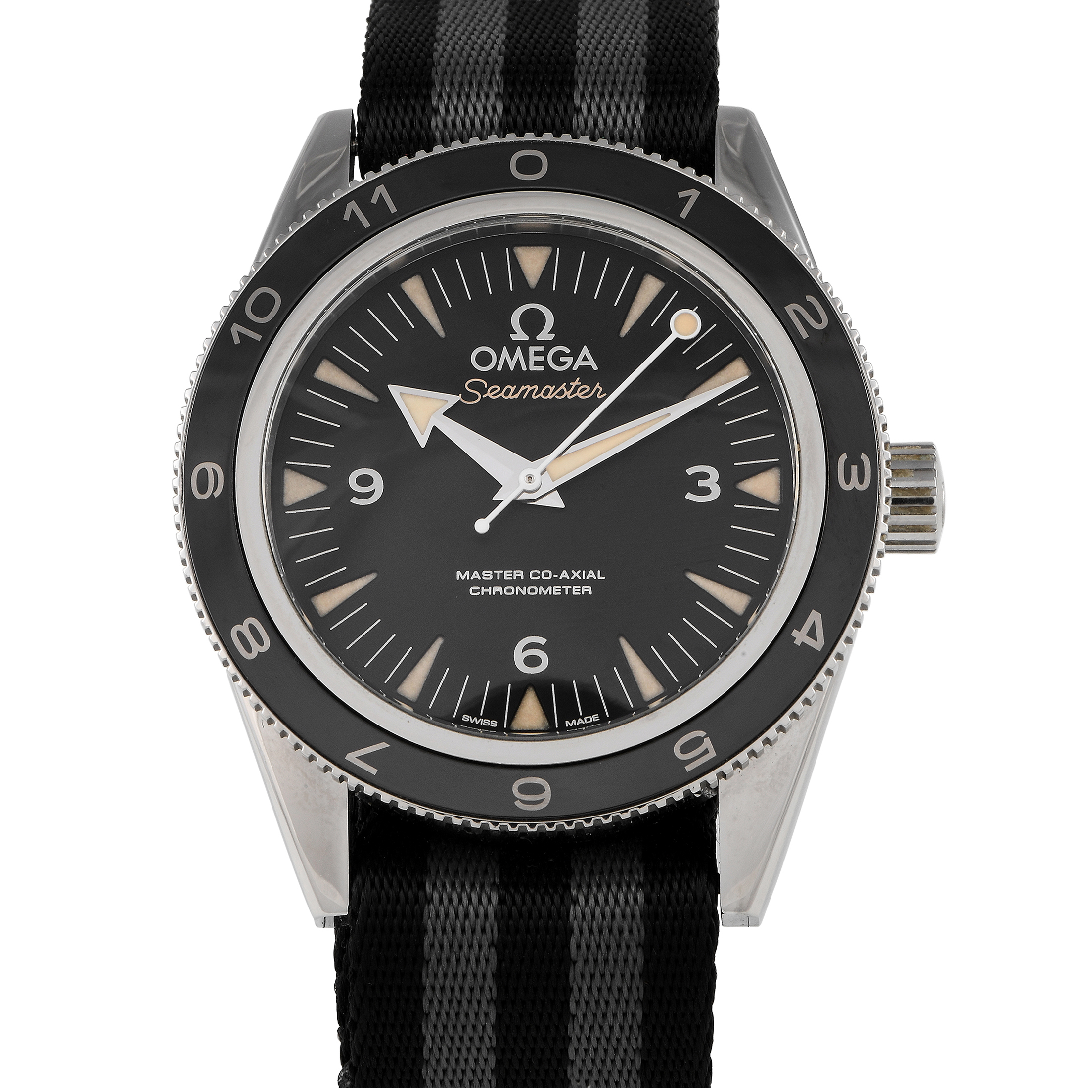 This pre-owned OMEGA Seamaster 300 SPECTRE Steel on NATO Strap Limited Edition Watch 233.32.41.21.01.001 is accompanied by papers, a flat-link bracelet, a leather strap, and the manufacturer’s box.