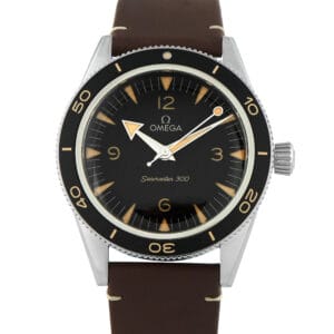 Crafted in stainless steel and sized at 41mm, the Omega Seamaster 300 ref. 234.32.41.21.01.001 pairs vintage-inspired design with modern precision. It has a black sandwich dial with recessed vintage Super-LumiNova hour markers, broad arrow hands, and a black aluminum diving bezel. It runs on Caliber 8912, a Co-Axial Master Chronometer no-date automatic movement certified by METAS for exceptional accuracy. The watch is fitted with a domed sapphire crystal and a vintage-style leather strap.