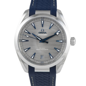 The Omega Seamaster Aqua Terra ref.220.12.41.21.06.001 features a design that combines sport-inspired resilience and masculine charm. It has a 41mm steel case worn on a blue rubber strap with a gray lining. The gray dial has the distinct horizontal teak pattern of Aqua Terra, enhanced by the presence of well-defined hands and hour markers in blue, all with black outline and white Super-LumiNova fill. The watch is driven by OMEGA Master Chronometer caliber 8900, an automatic movement certified by METAS, offering 60 hours of power reserve.