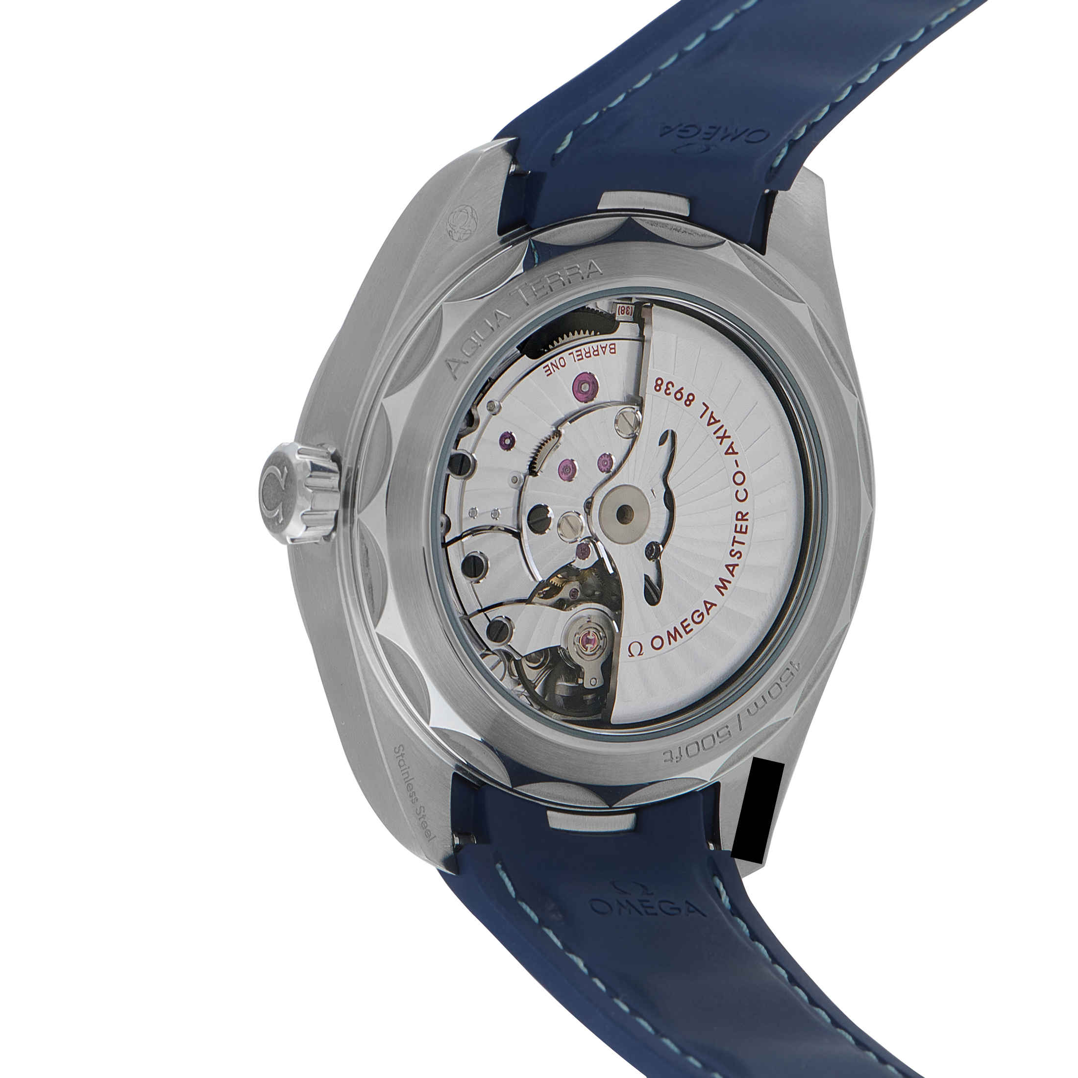 A global complication set against a deep blue expanse. The travel-driven Seamaster ref. 220.12.43.22.03.001 places a topographic view of the Earth at its center, rendered in grade 5 titanium and encircled by a 24-hour indication dividing day and night across world cities. Vertical teak stripes run across the dial perimeter, affirming its ties to the Aqua Terra collection. The 43mm case is in stainless steel, matched with a blue rubber strap. Power comes from the Co-Axial Master Chronometer calibre 8938, visible through the sapphire back. The movement features twin barrels and METAS certification for magnetic resistance and chronometric accuracy.