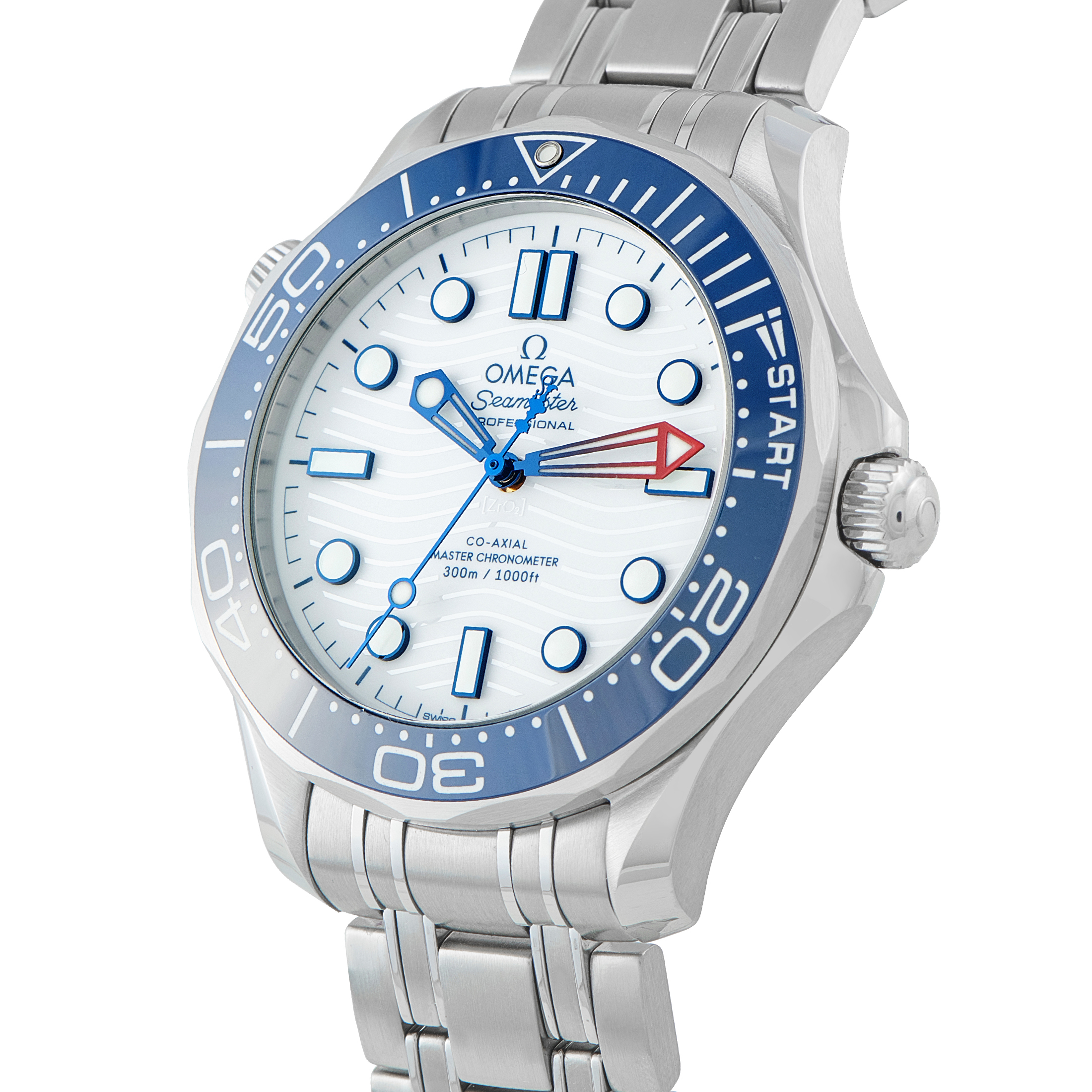 Built for countdown precision, with versatility for daily wear. The Seamaster ref. 210.32.72.20.04.002 takes the Diver 300M format and redirects it towards the America’s Cup. Its white ceramic dial is laser-engraved with a wave pattern, adding depth beneath a display focused on timing. The central seconds hand carries the America’s Cup trophy as a counterweight, a small but deliberate detail tied to the event. Surrounding the dial is a blue ceramic bezel calibrated for racing, marked with twin 5-minute pre-start segments and a START zone indicated by regatta flag colors.