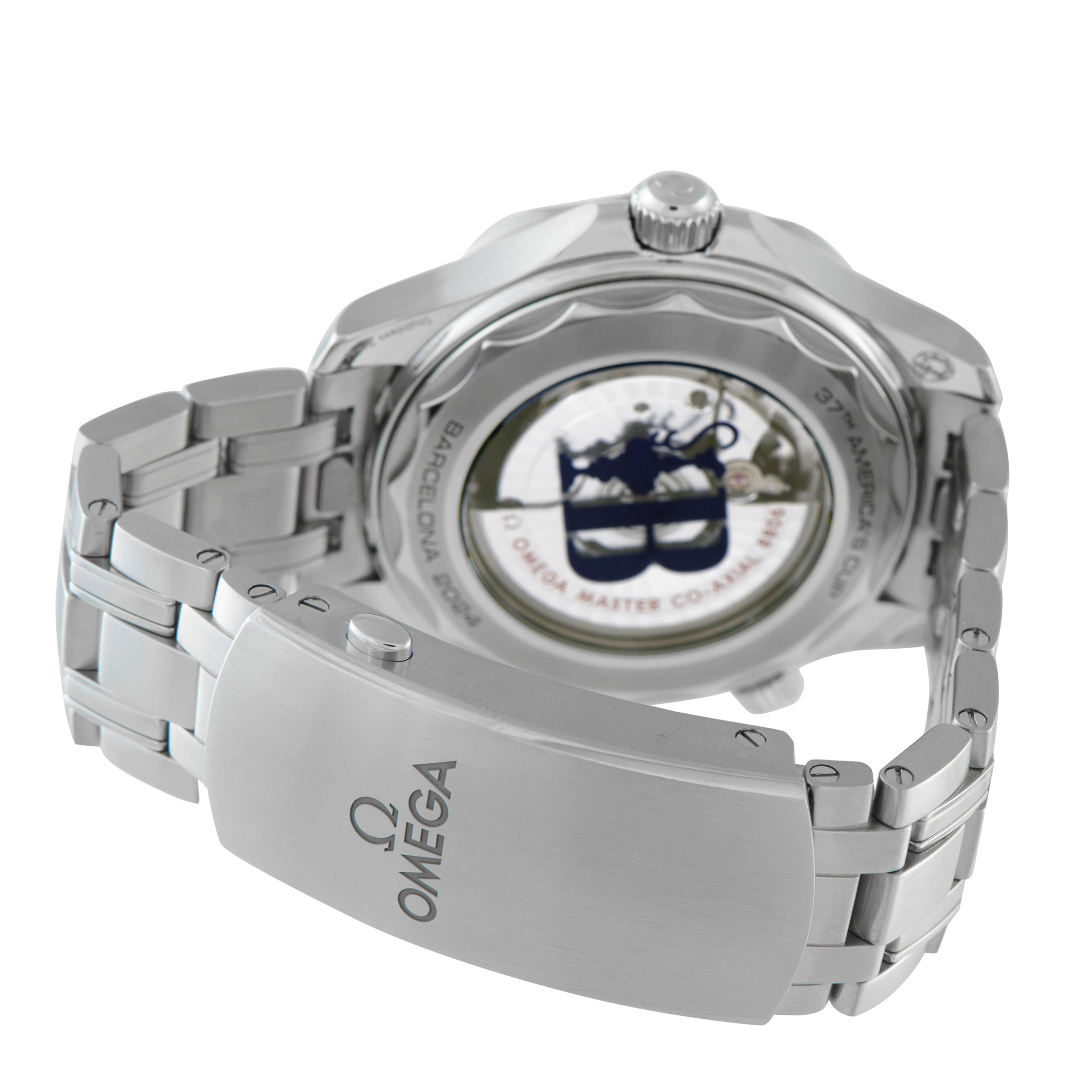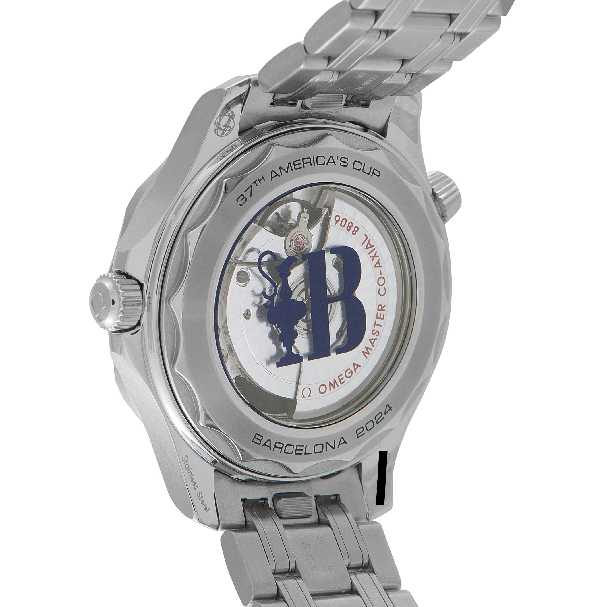 On the reverse, the sapphire caseback features the Barcelona emblem, referencing the host city and the “Auld Mug.” Power comes from the Co-Axial Master Chronometer caliber 8806, a self-winding movement with approximately 55 hours of power reserve.