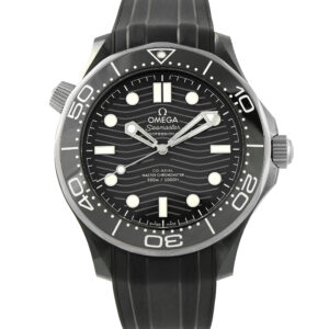 The Omega Seamaster Diver 300M ref. 210.92.44.20.01.001 offers professional-grade capability expressed through a stealth, monochrome presence. Its 43.5 mm case is built from matte black ceramic with titanium components (bezel, caseback, helium escape valve), giving it lightweight strength and scratch-resistance. The black ceramic dial is laser-engraved with the wave pattern, paired with Super-LumiNova-filled hands and hour markers for visibility in low light. The case back reveals the caliber 8806 that powers the watch. This METAS-certified Master Chronometer movement with Co-Axial escapement provides about 55 hours of power reserve. This timepiece comes on a black rubber strap with a matching ceramic buckle.