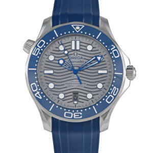 The OMEGA Seamaster Diver 210.30.42.20.06.001 is a dive watch recognized for its performance and excellent build quality and finish. The watch has a 42mm case in stainless steel, fitted with a blue ceramic bezel with an enameled diving scale. It also has a ceramic dial in PVD chrome color decorated with a laser-engraved wave pattern. Also on the dial are raised and luminous hour markers, blued and Super-LumiNova-filled skeleton hands, and a date indicator at 6 o’clock. Visible through its sapphire case back is the METAS-certified Master Chronometer caliber 8800 that offers 55 hours of power reserve.