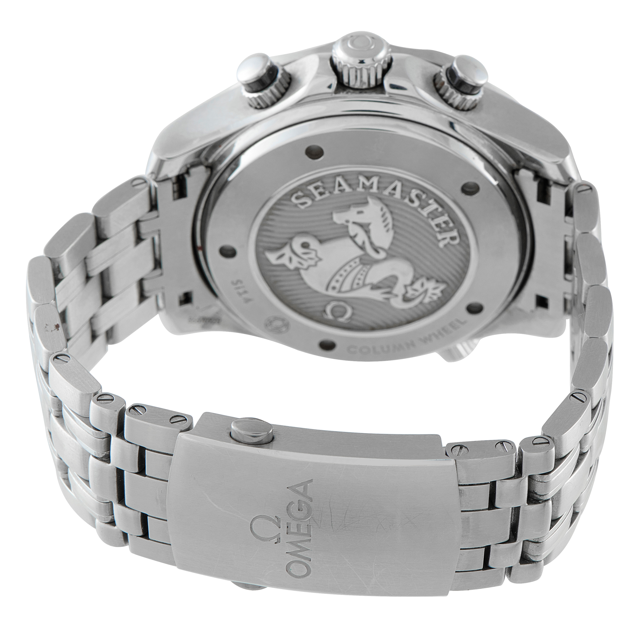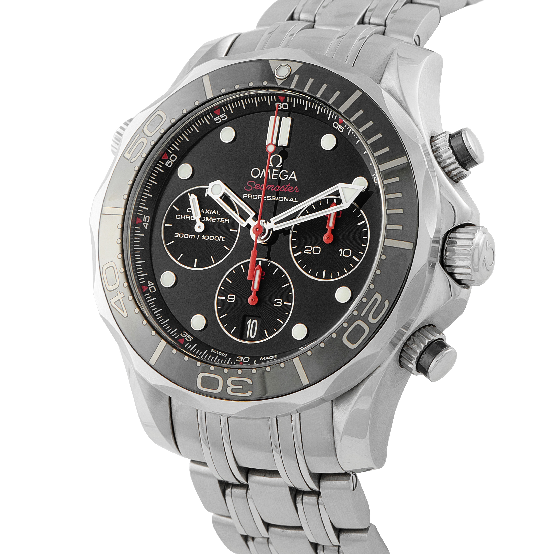 Equally at home below the surface or above it, this is a watch built to move between extremes without compromise. The Omega Seamaster Diver 300M Chronograph ref. 212.30.44.50.01.001 has a 44mm steel case that carries real mass, reinforced by a solid steel bracelet and a scalloped bezel that offers grip and instant recognition. The black dial adopts a tricompax chronograph layout for intuitive reading, complemented by broad hands and markers with strong lume. Beneath the surface, the self-winding Caliber 3330 ensures long-term reliability and a power reserve of approximately 52 hours.