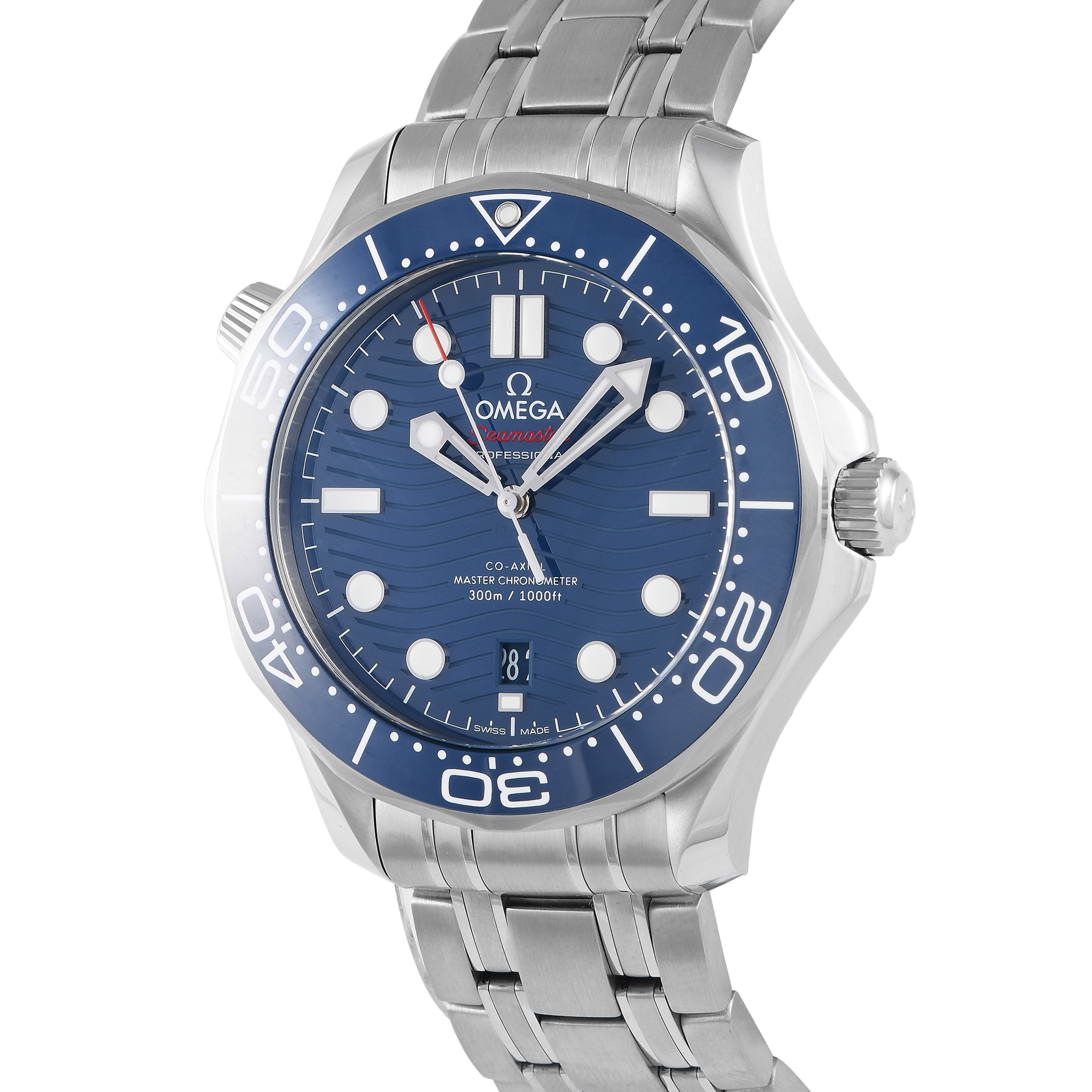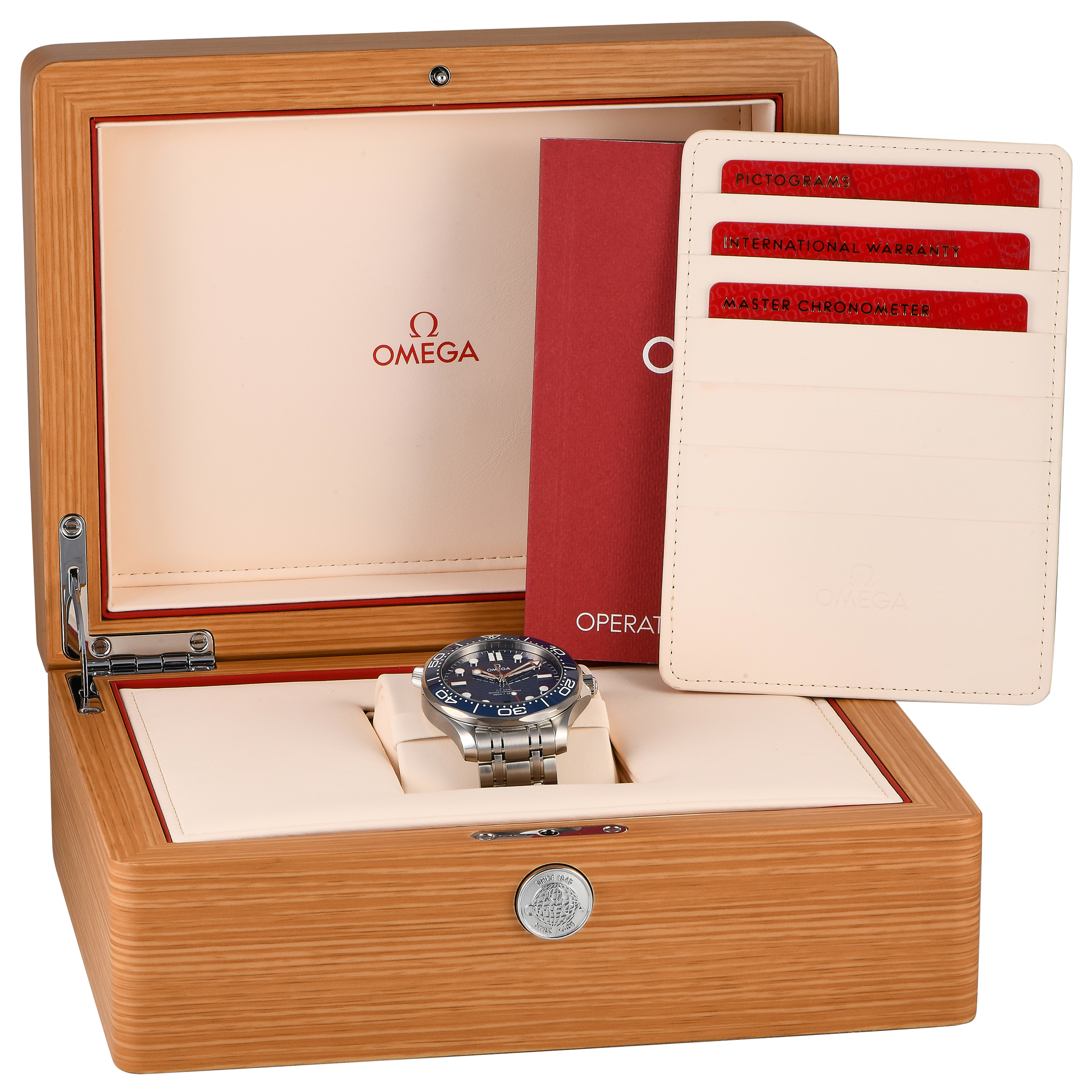 This unworn OMEGA Seamaster Diver 300M Blue Dial Watch 210.30.42.20.03.001 is accompanied by papers and the manufacturer’s box.
