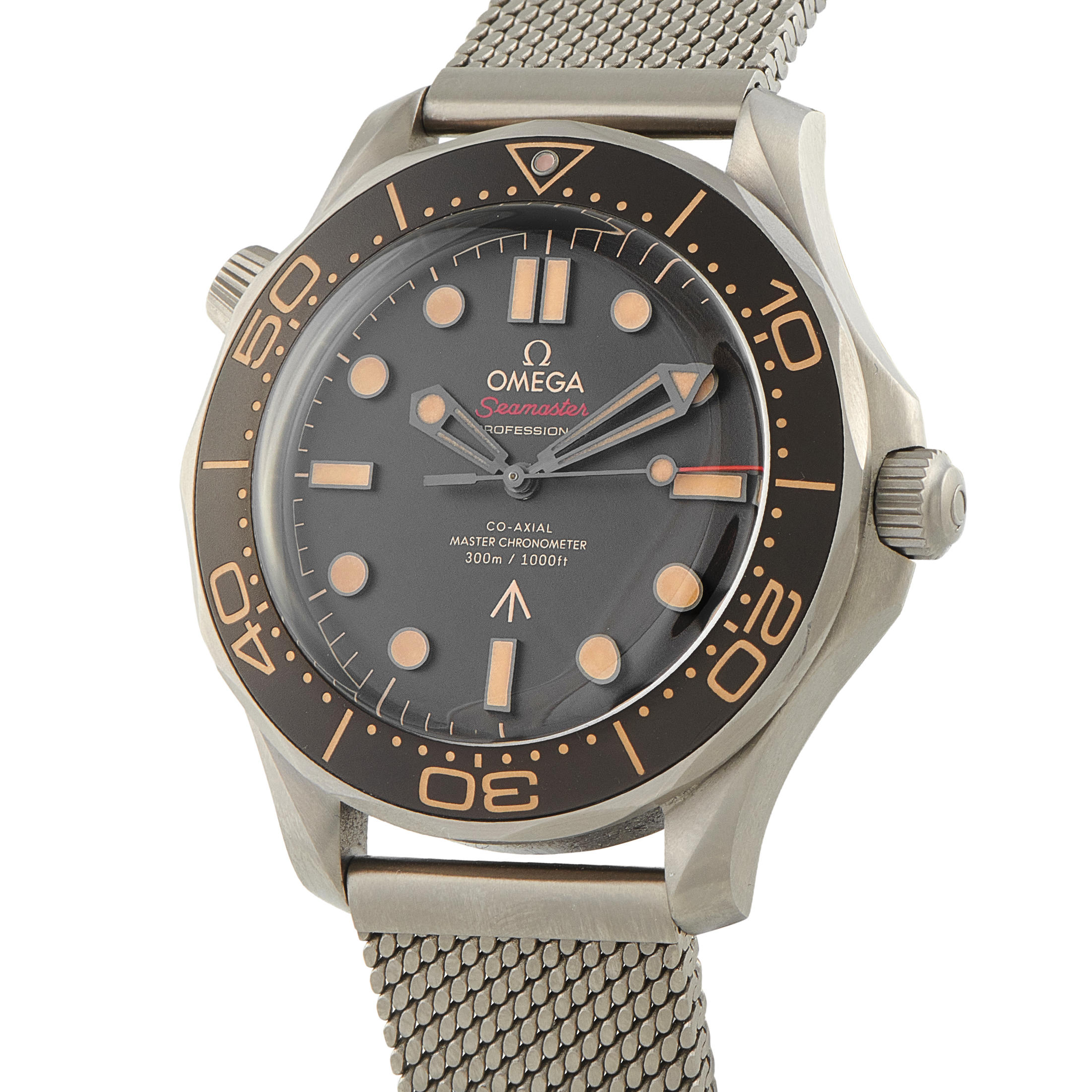 210.90.42.20.01.001 adopts a full titanium construction, keeping the 42mm case and Milanese mesh bracelet notably right on the wrist. The dial and bezel showcase a matte, dark brown tone, paired with vintage-toned Super-LumiNova and skeletonized handset.