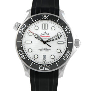 With a robust steel case on a classic black rubber strap and a clean white dial, this Seamaster Diver catches eyes with quiet confidence. Its 42mm case houses the Omega Master Co-Axial caliber 8800, a METAS Certified Master-Chronometer movement, beating at 25,200 vph, with 55 hours of power reserve. The watch’s high-loss white dial features a laser-engraved wave design, complemented by applied hour markers with black outline and luminous fill. The blackened steel hands also features luminous tips. Framing the watch’s face is a black ceramic bezel with a white enamel diving scale.