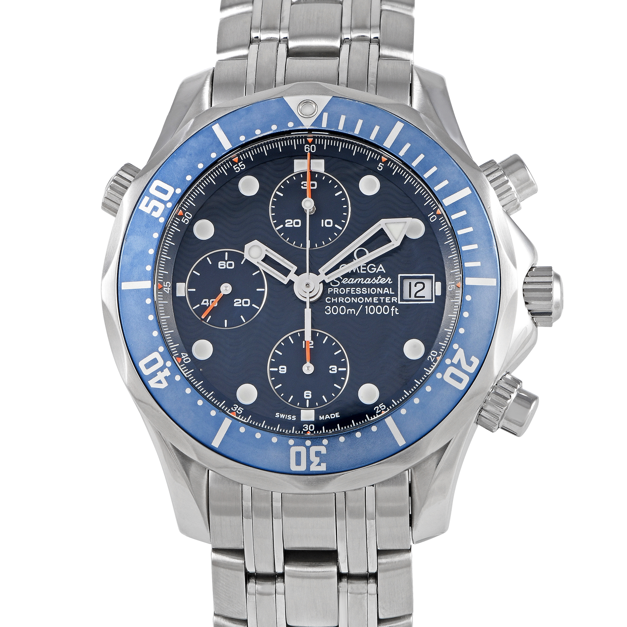 This expertly crafted timepiece includes a blue unidirectional rotating bezel mounted upon a 41.5 mm stainless steel case and a matching stainless steel bracelet. The blue dial is appropriately decorated with a wave pattern, and includes features like luminous skeleton hands, luminous dot index markers, a date dial located at the 3-o-clock position, a small seconds subdial, and both 30-minute and 12-hour recorders. It’s powered by an Omega 1164 movement with 44 hour of reserve time and is water resistant up to 300 meters.