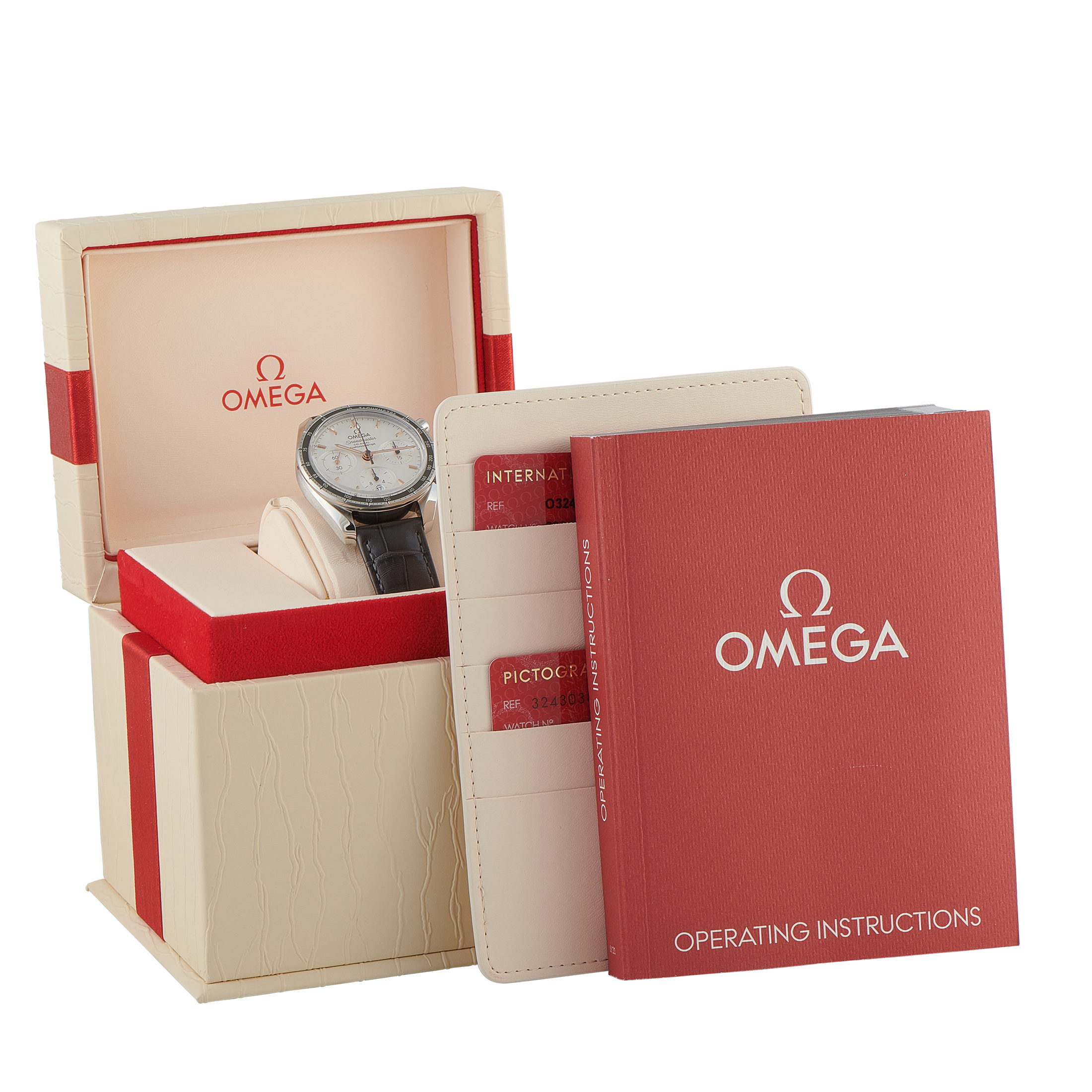 Papers and the manufacturer’s box accompany this pre-owned Omega Speedmaster 38 Steel Watch 324.30.38.50.02.001.