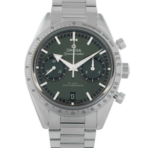 Inspired by the 1957 original, this Speedmaster ’57 ref. 332.10.41.51.10.001 showcases a remarkable blend of vintage charm and modern precision. This specific model bears a green dial and is known for its smaller profile compared to other Speedmaster variations. Rhodium-plated hour markers and “broad arrow” hands mark the dial, along with a date window at 6 o’clock, small seconds at 0, and 12-hour and 60-minute chronograph recorders at 3 o’clock. Housed in its 40.5mm stainless steel case is the OMEGA Co-Axial master Chronometer Caliber 9906, a highly precise movement certified by METAS.