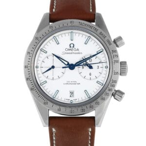 The Omega Speedmaster ’57 ref.331.92.42.51.04.001 is a fantastic watch boasting a design that is a mix of the old and new. It has a 41.5mm-wide titanium case worn on a brown leather strap. The lacquered white dial offers excellent legibility, with blue hands that create a nice contrast. A scratch-resistant sapphire protects the front and back of this chronograph. The watch is driven by the OMEGA Co-Axial caliber 9300 self-winding movement with 60 hours of power reserve.