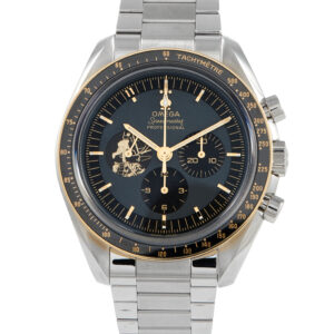 Not one step, but just a click away to get this highly prized collector’s item. The limited edition OMEGA Speedmaster Apollo 11th 50th Anniversary ref. 310.20.42.50.01.001 was released in only 6,969 pieces. This iconic watch has a 42mm steel case fitted with an 18K Moonshine Gold bezel and polished-brushed steel bracelet. The bezel bears a black ceramic ring with Ceragold tachymeter scale. On the watch’s varnished gray and black dial are 18K Moonshine Gold hour markers and hands. The Arabic numeral 11 marks the 11 o’clock position. At 9 o’clock is a striking sub-dial laser engraved in Moonshine Gold with the image of Buzz Aldrin about to walk on the moon.