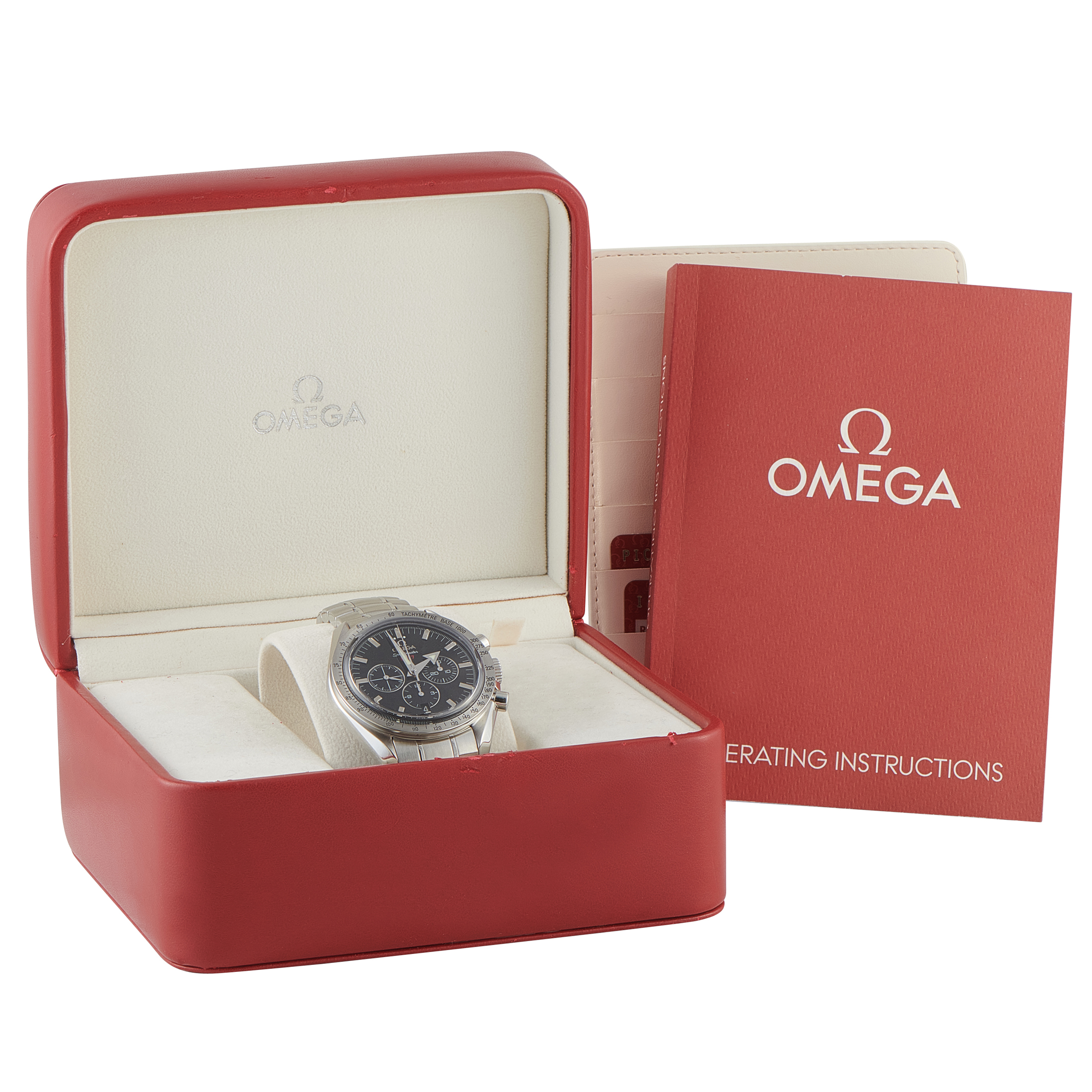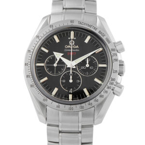 Papers and the manufacturer’s box accompany this pre-owned Omega Speedmaster Broad Arrow Steel Watch 321.10.42.50.01.001.