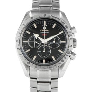This iconic design features a 42mm case, a fixed bezel with tachymeter markings, and a bracelet – all crafted from Stainless Steel. On the bold black dial, you’ll find luminous “broad arrow” hands, a small seconds subdial, dual chronograph subdials, and a date display located at the 6-o-clock position.It’s powered by an automatic Omega 3313 calibre movement with 52 hours of reserve time and is water resistant up to an impressive 100 meters.