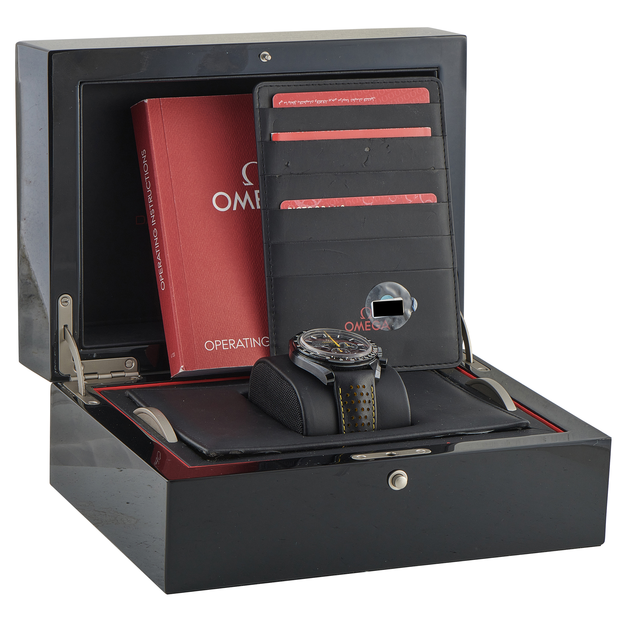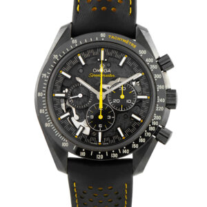 Papers and the manufacturer’s box accompany this pre-owned Omega Speedmaster Dark Side of the Moon Apollo 8 Chronograph Black Ceramic Watch 311.92.44.30.01.001.
