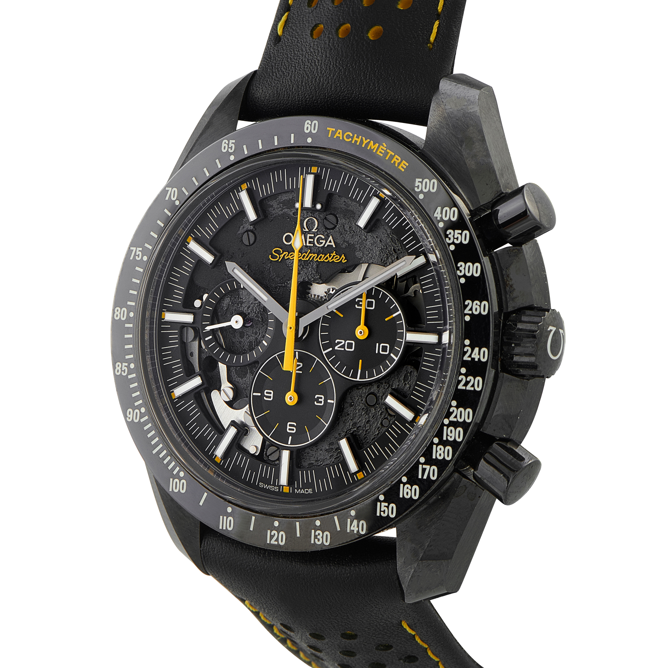 This timepiece is fitted with a perforated black leather strap with a bright yellow rubber lining, complementing the yellow chronograph hands.