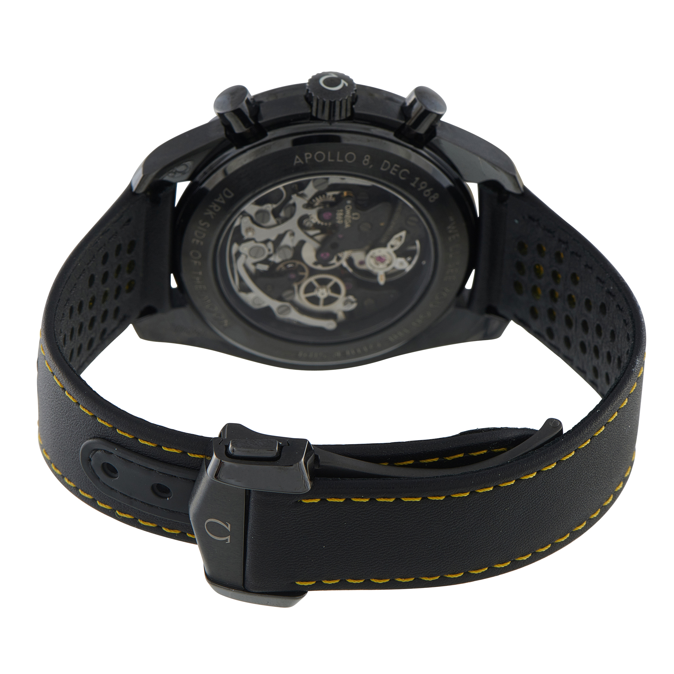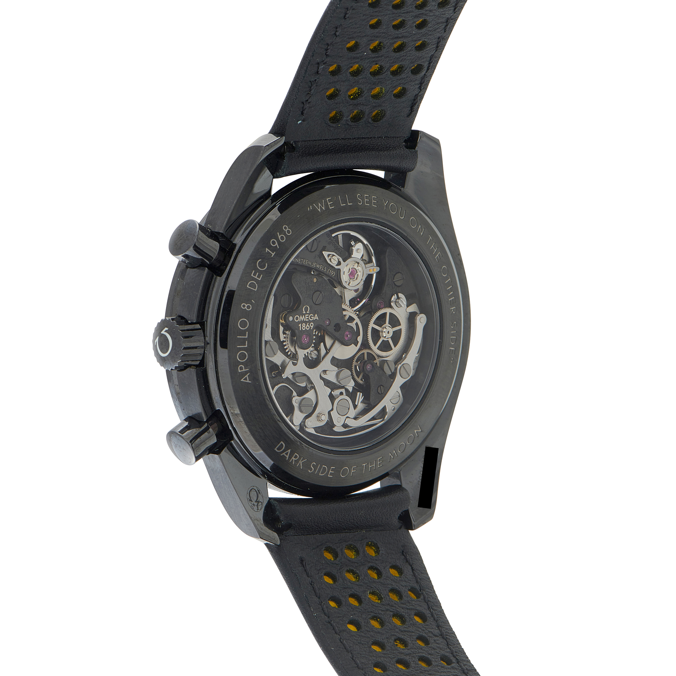 The special edition OMEGA Speedmaster ref. 311.92.44.30.01.001 captures the very essence of the 1969 space exploration. Its 44.25mm case, crafted entirely from a single block of black ceramic, houses an extraordinary skeletonized dial showcasing the blackened caliber 1869 manual-winding movement. To showcase the cratered surface of the moon, the main plate and bridges have been intricately textured using a highly specialized laser ablation process. From the transparent case back, you’ll see the “dark side” of the movement, which is the side humanity first saw during the Apollo 8 mission. The words “WE’LL SEE YOU ON THE SIDE,” spoken by Command Module Pilot Jim Lovell, are engraved on the case back.