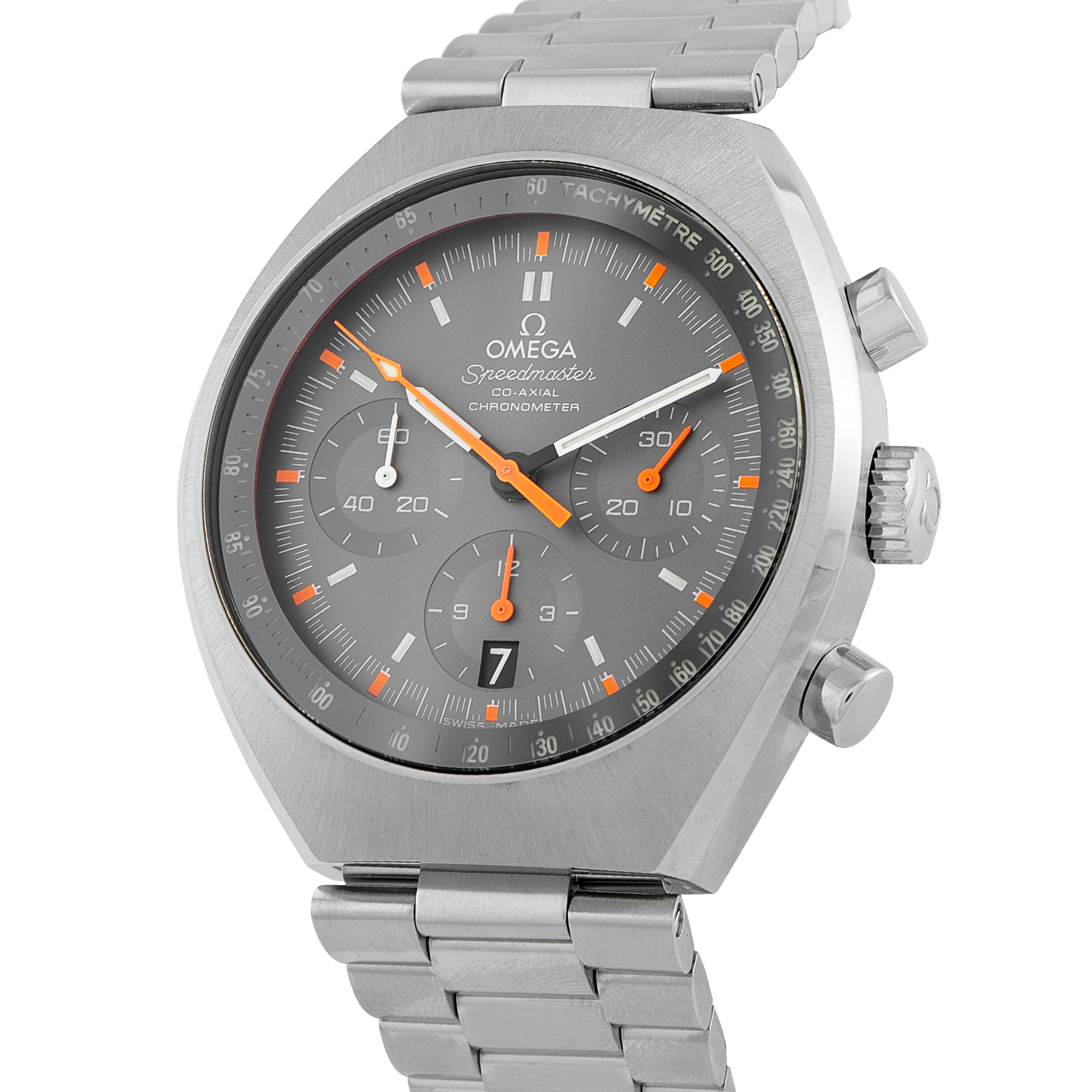 The OMEGA Speedmaster Mark II ref. 327.10.43.50.06.001 revisits a 1969 profile with a modern point of view. Its tonneau-shaped steel case stretches to 42.4mm, brushed end-to-end for continuity. The dial departs from the Moonwatch formula, presenting a matte gray base carrying fluorescent orange chronograph hands and racing track. The tachymeter is protected by a sapphire crystal and back-lit by a Super-LumiNova ring.